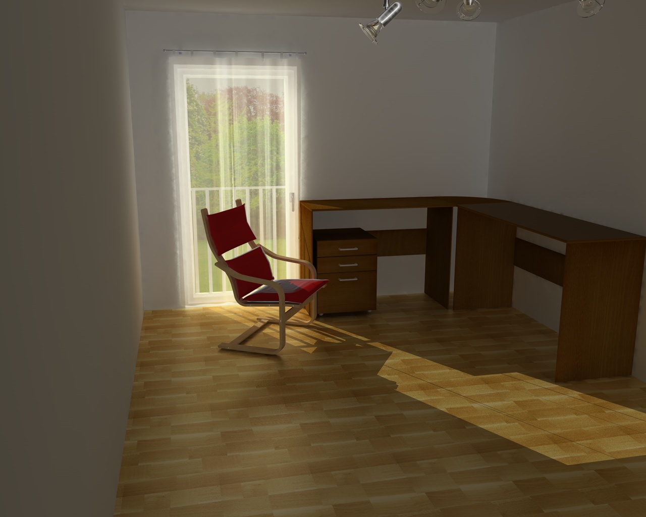Vorhang, Drehstuhl, PC, Schreibwaren, Tischlampe