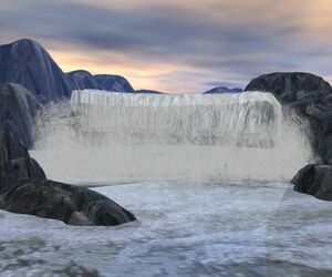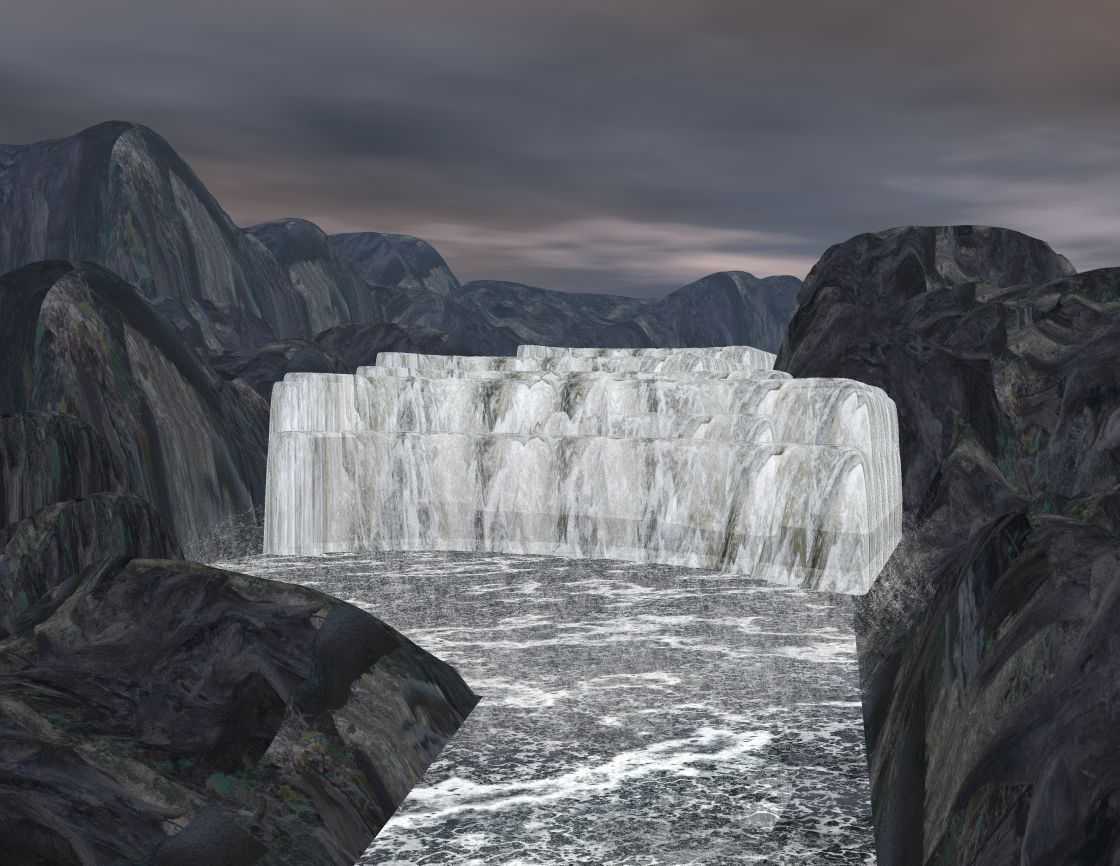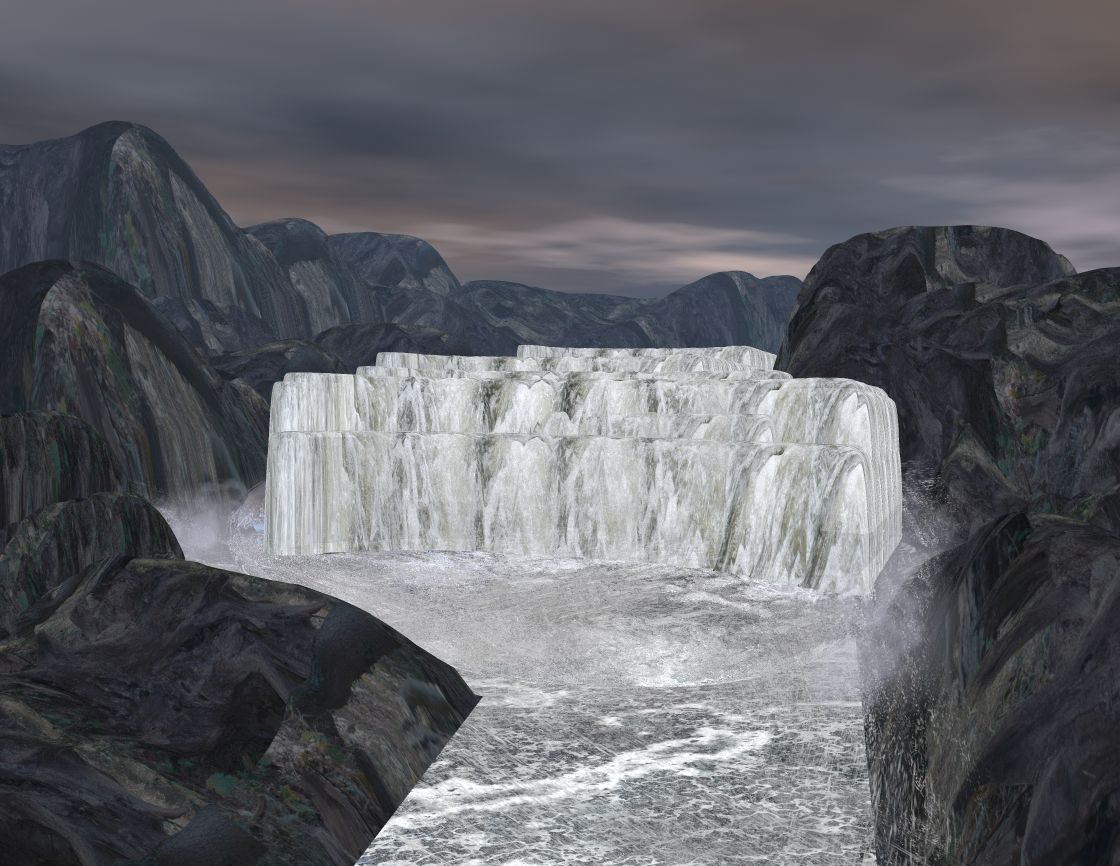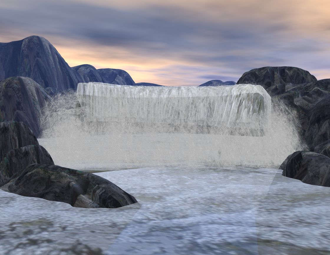 ich hab die zweite Version noch einmal überarbeitet und Gischt etc hinzugefügt, auch hab ich die Textur noch etwas bearbeitet , damit das Terrain unter dem Wasserfall nicht mehr so als "Borte" hervorscheint.