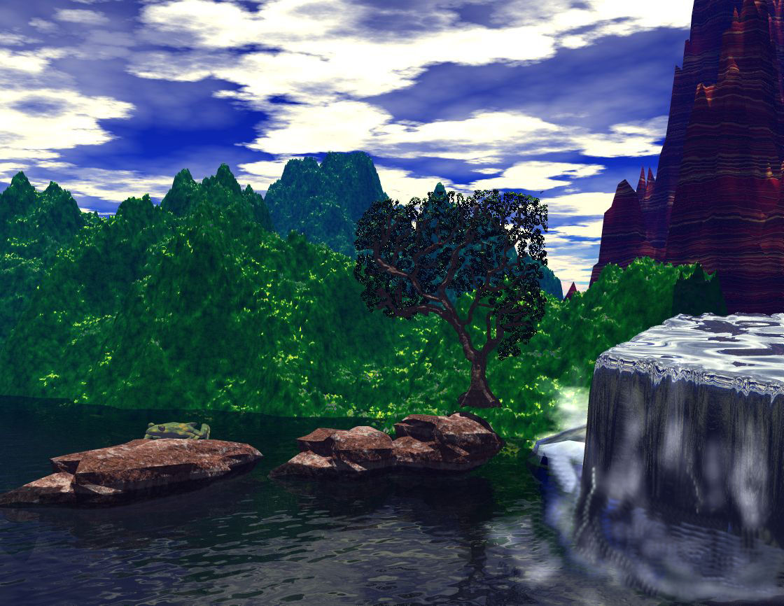 ich hab mich noch mal mit dem Wasserfall beschäftigt . Diesmal bin ich nach Yoro`s Tut vorgegangen. Die Gischt ist mit Kugeln in die Länge gezogen und mit Wolkentex belegt , als Tex für Wasserfall hab ich die Tex von DevisShadow verwendet . Den Wassefall selbst hab ich extra mit beleuchtet.