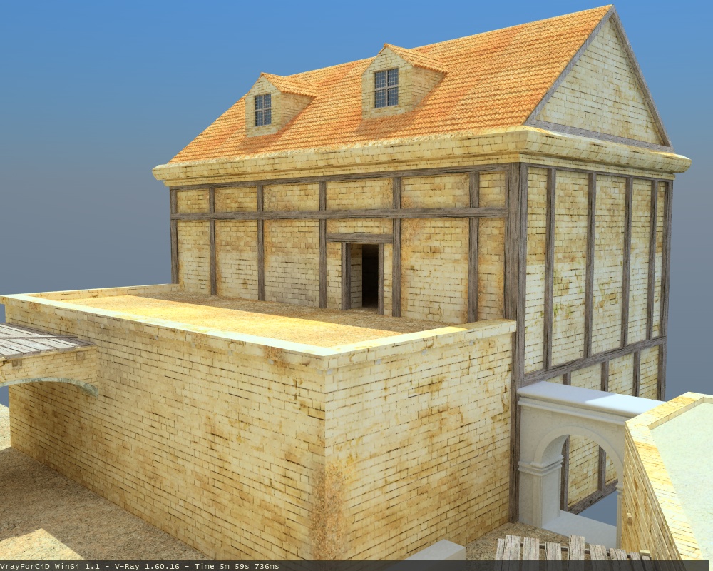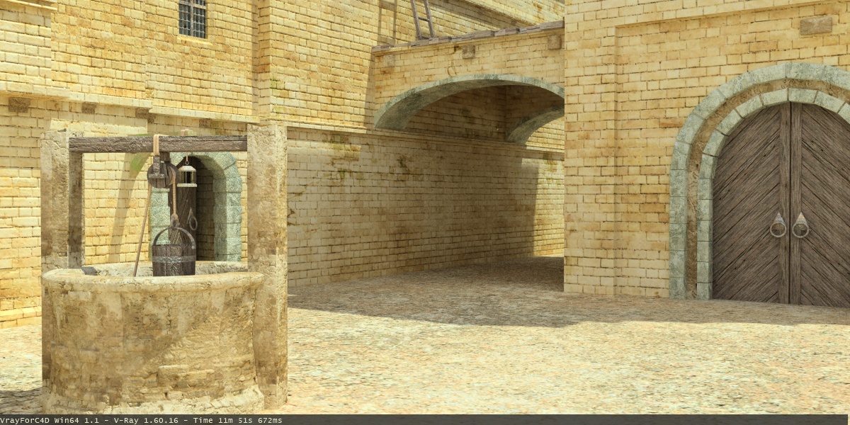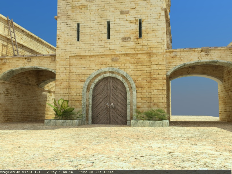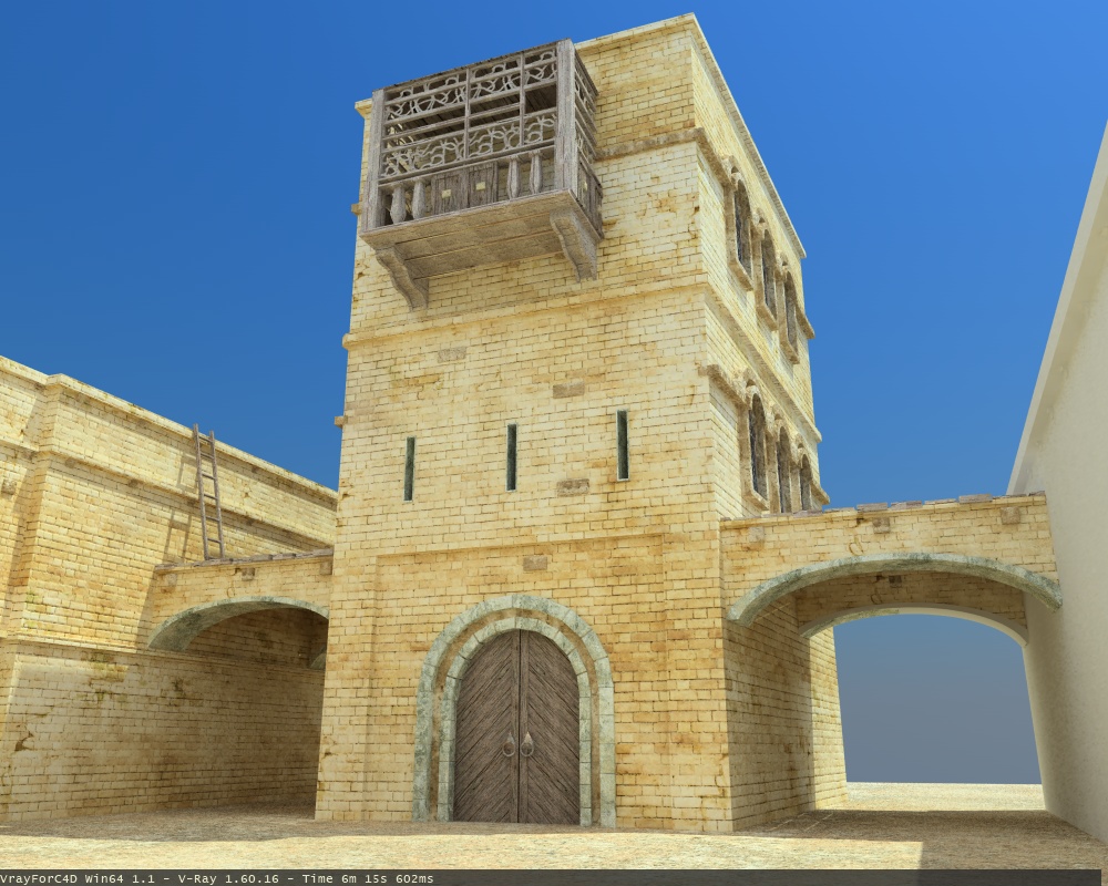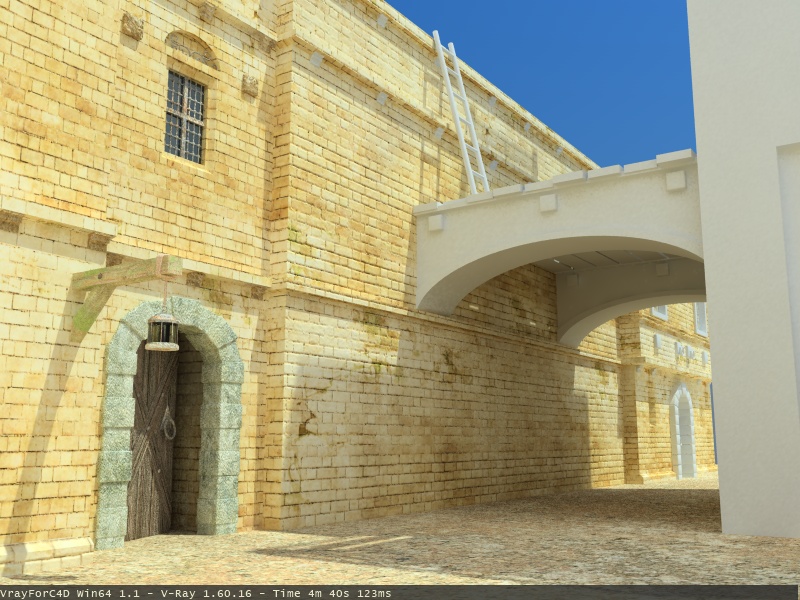 Inzwischen habe ich mal weitertexturiert. Jetzt muss ich nur noch fenster etc vom hintersten haus, die 3 Bögen und die restlichen 2 Häuser texturieren, dann gehts an die Details (etwas Leben in die szene bringen)