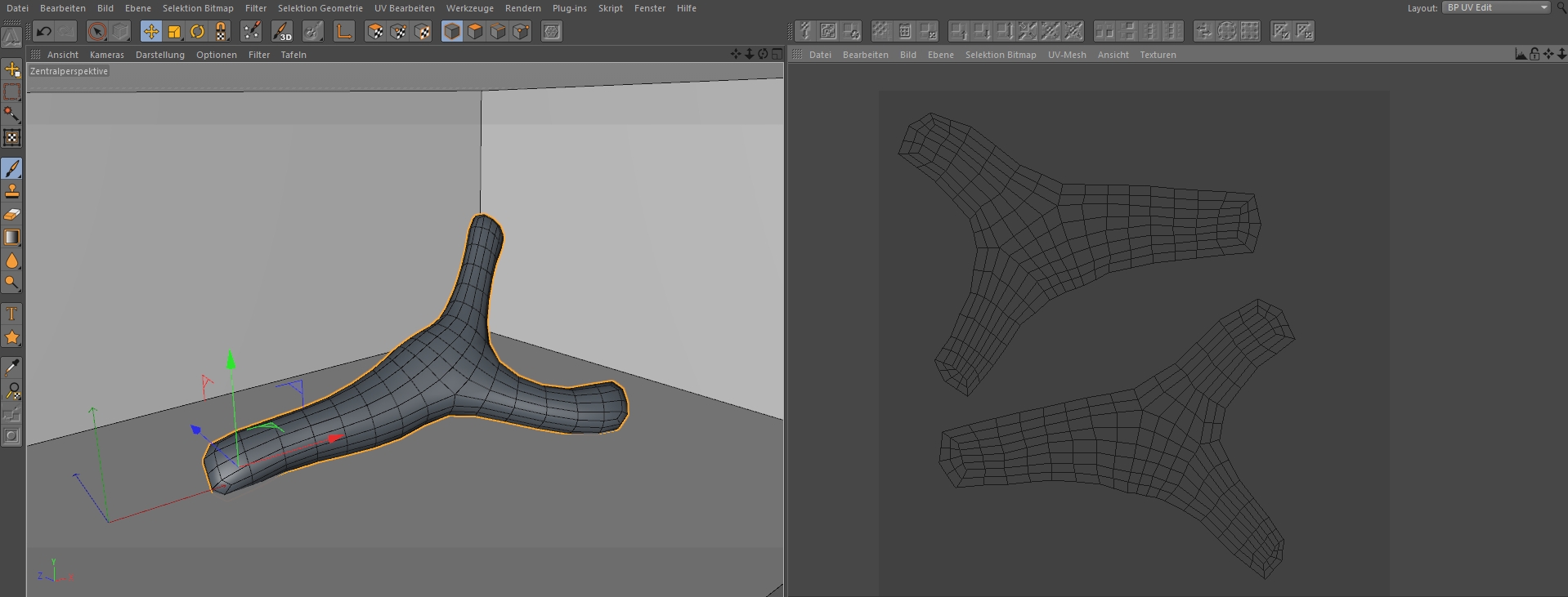 Aber damit du das Displacement richtig backen kannst, und auch korrekt gerendert wird, musst du selbst eine UV-Map anlegen (die Abwicklung des Objekts)