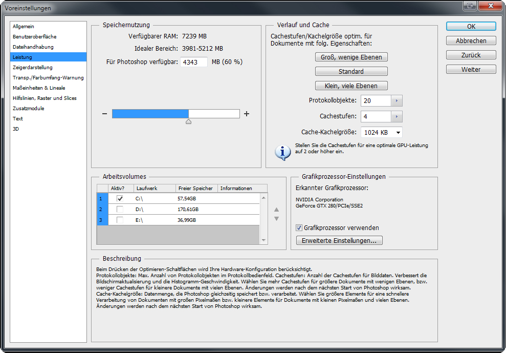 probiere doch mal folgendes aus. Wenn Du CS6 64Bit geöffnet hast, gehe auf Bearbeiten/Voreinstellungen/Leistung. Dort unter Verlauf und Cache stellst Du es mal wie im Bild zu sehen ein. Falls das nicht hilft kannst Du auch mal den Grafikprozessor abschalten. Ich hatte auch das Problem und konnte es mit diesen Einstellungen beseitigen.
