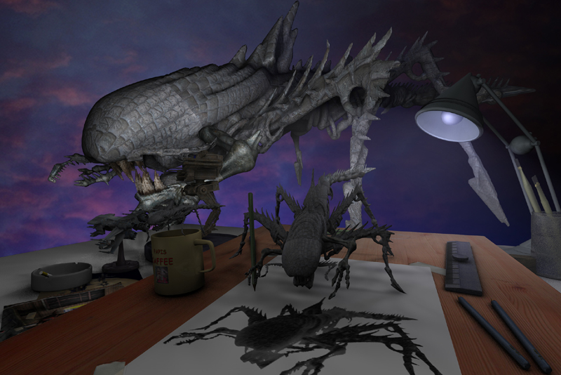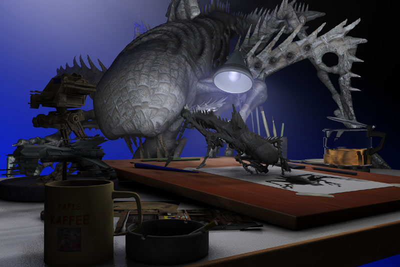 Numm ist der Zeichner echt seelisch fertig. Die Insectoiden krabbeln selbst in den Cafe und wollen auch noch Zeichnen. Als ob die Angst gefressen zu werden nicht schon genug wäre.Erstelt wie immer in C4d.