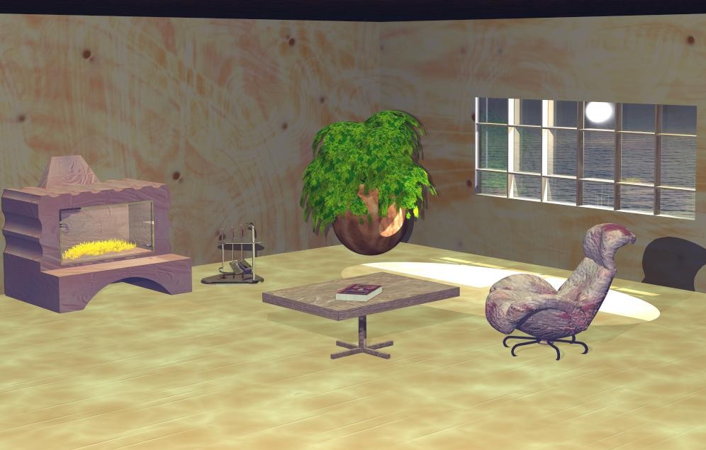 Ich habe mal versucht ein Wohnzimmer zu gestalten. Kamin, Tisch, Buch Innenraumgestaltung und der Pflanzbottich sind reine Brycearbeiten. Das Kaminzubehör ist in Cinema erstellt.