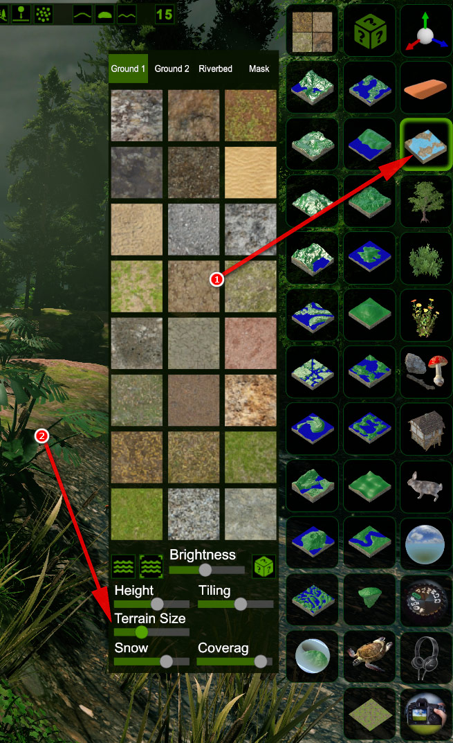 Die Größe des Terrains kannst du verändern, indem du auf den Terrainbutton klickst und dann den Schieberegler bei Terrain Size nutzt: