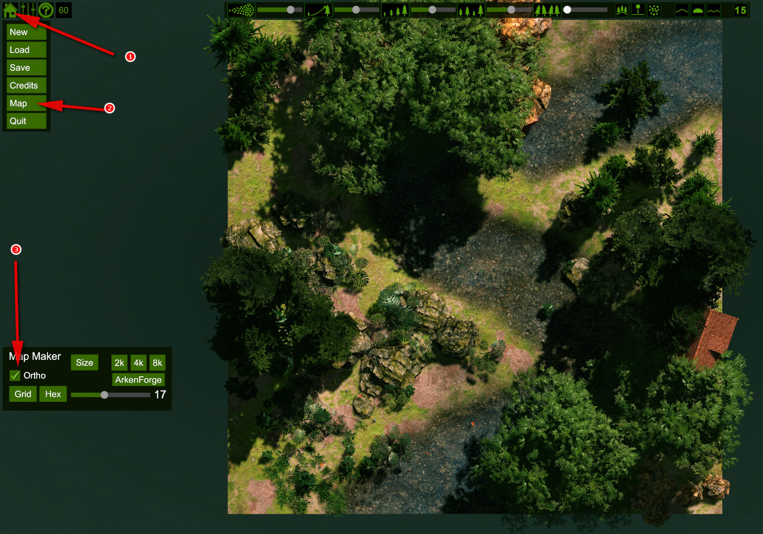Noch ein Tipp, wenn man zwischendurch in den Map-Maker wechselt und die Orhto-Ansicht verwendet, kann man sehr genau die verschiedenen Pflanzen, Felsen, Gegenstände usw. platzieren, ganz nebenbei ergibt sich noch eine supercoole Draufsicht...