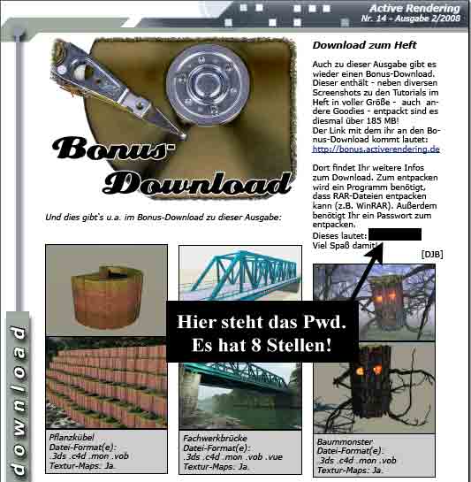ich denke, du hast vielleicht das Passwort aus der falschen Ausgabe genommen? In der Active Rendering Nr. 14 (hat das Orange Cover wie im ersten Posting in diesem Thread) steht das asswort auf Seite 4. Sollte so aussehen wie im Anhang...