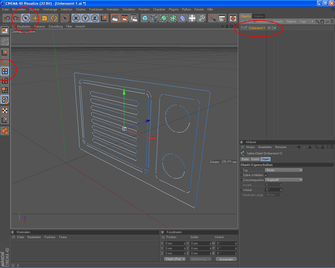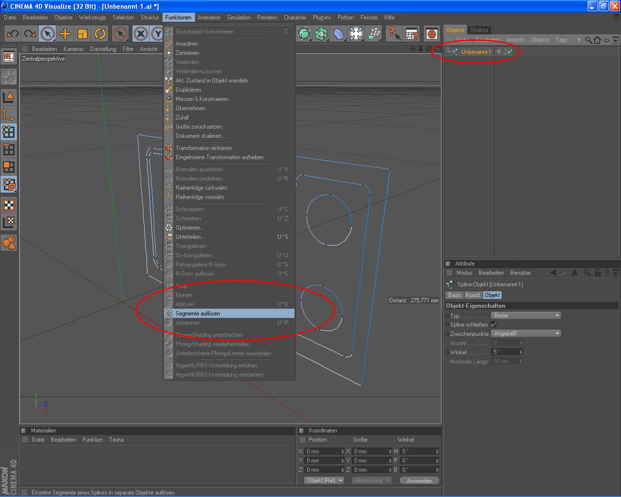c: Cinema legt jede Form innerhalb Deines Ausgangssplines als separates Spline an. Wichtig dabei: Der oberste Spline bleibt unverändert, ist also Deine Ausgangsform, das bedeutet, dass in meinem Beispiel Unbenannt-1 kein Nullobjekt ist! Darunter kommen dann durchnummeriert alle Einzelformen (Unbenannt1-2; Unbenannt 1-2...). Die kannst Du dann alle wie einzelne Splineobjekte bearbeiten.