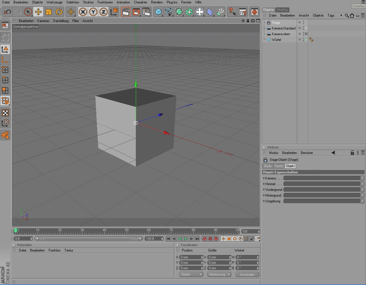 Das mit dem Stageobjekt fruchtet noch nicht. Um es einfach zu halten: Ich will eine Szene mit zwei Kameras rendern. Einen Würfel aus Standardsicht und ein bisschen von oben. Also am Ende will ich zwei Renderings haben: Eins, was den Würfel in Standardansicht zeigt, das andere von schräg oben. Kameras erstellen geht klar. Habe nun "Kamera-Standard" und eine "Kamera-oben". Die Editorkamera hat damit nichts zu tun. Die Kamera-Standard ziehe ich ins Stageobjekt. Dann muss ich das Ganze ja als Animation gestalten. Theoretisch reicht ja eine Animation mit zwei Bildern, für jede Kamera eins. Soweit richtig? Und dann? -