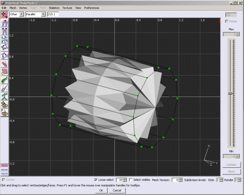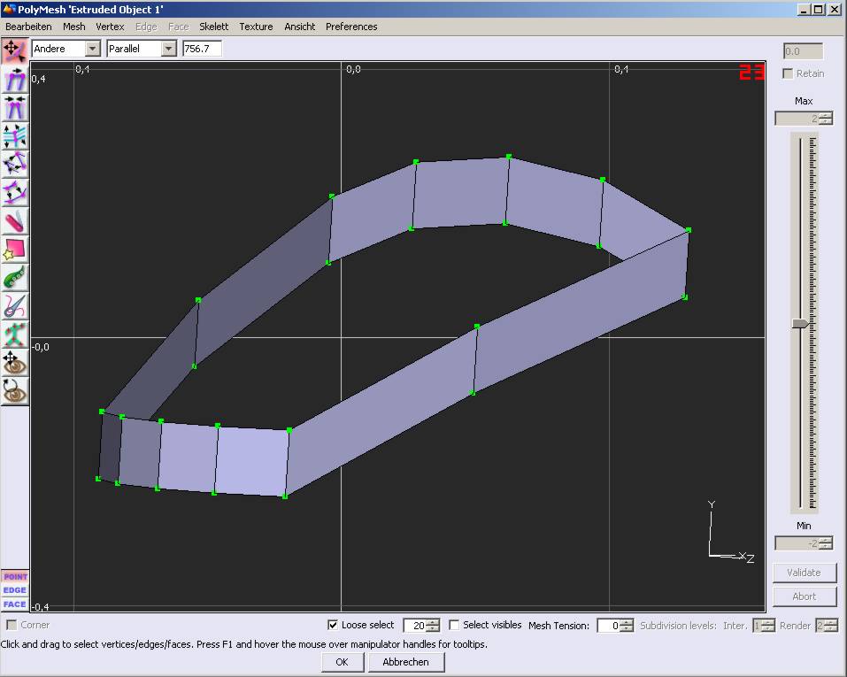 Die Meshdehnung ist eine häufige Quelle der Verwirrung für Neu-User. "Ich bewege, rotiere, skaliere die Auswahl und unselektierte Vertices bewegen sich mit den selektierten!" In solch einem Fall überprüfen Sie die Meshdehnung. Dieser Parameter bestimmt die Entfernung (in Punkten/Vertices) über die ein Punkt einen anderen bei Bewegung beeinflußt. Die Entfernung wird also über die Anzahl der Punkte, bzw. Kanten gemessen. Ein Wert von 0 bedutet das ein bewegter Punkt keinen Einfluß auf seine Nachbarn hat, während das Erhöhen des Wertes entsprechend weiteren Einfluß hat.