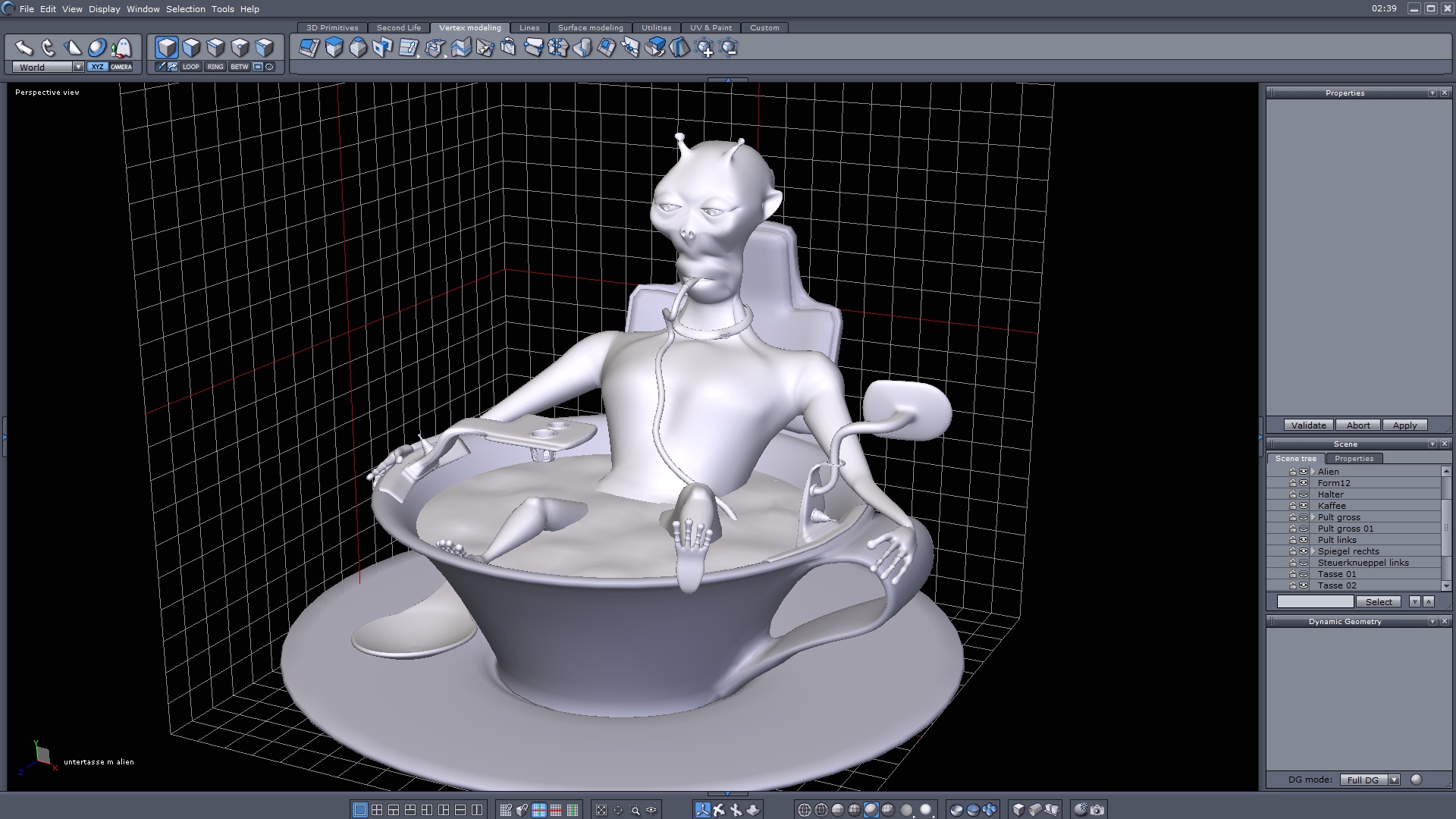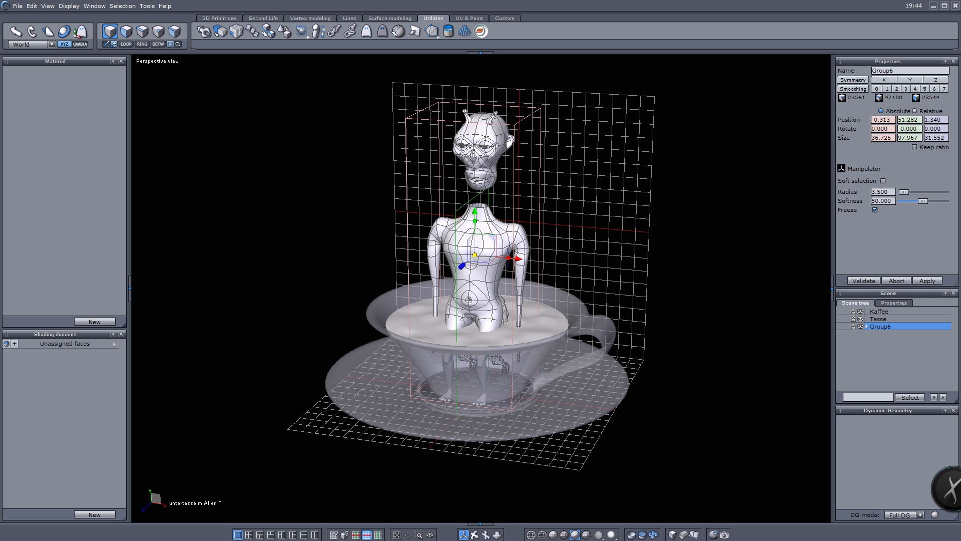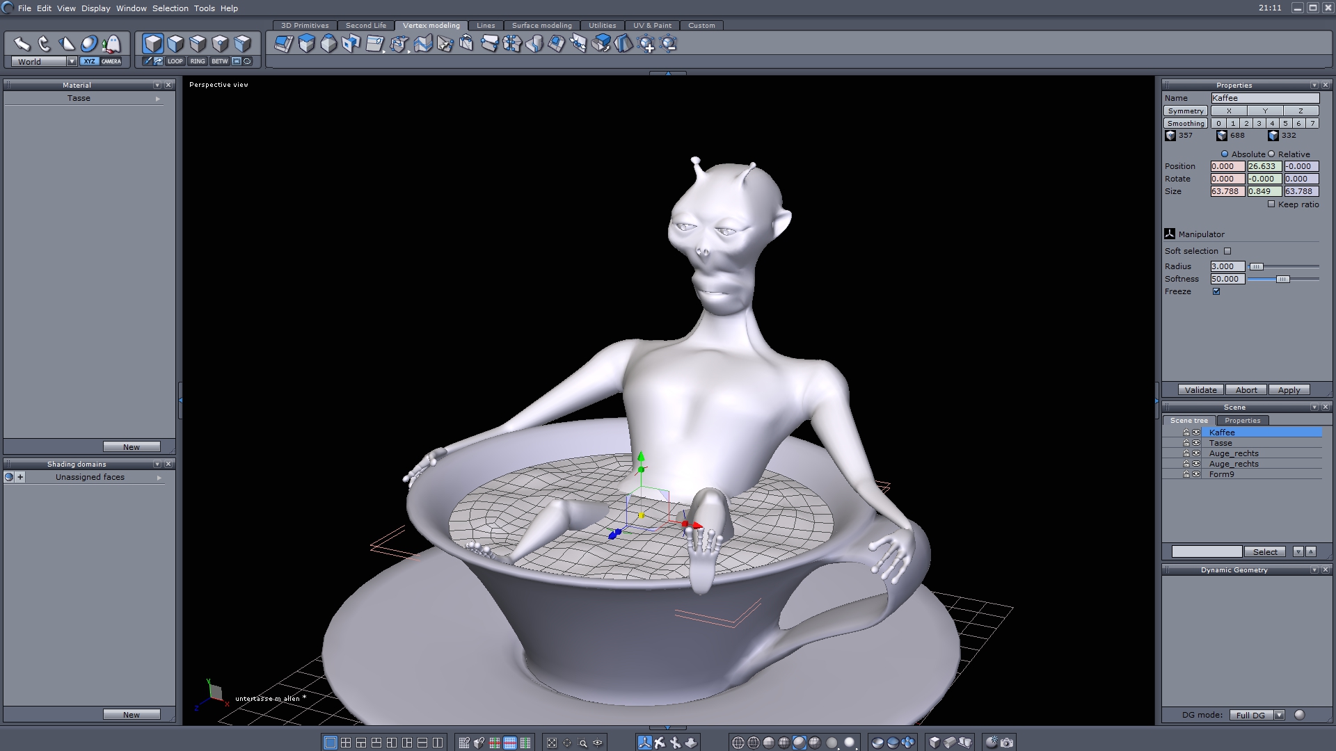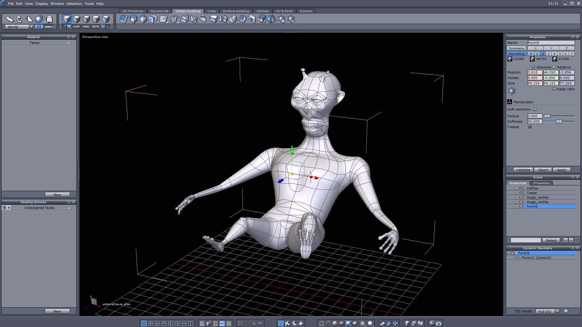 Das Alien ist nicht geriggt und wird somit in Hexagon in Position gebracht. Da muss auch mal der Kopf vom Rumpf getrennt werden und andere Gliedmaßen neu positioniert werden.