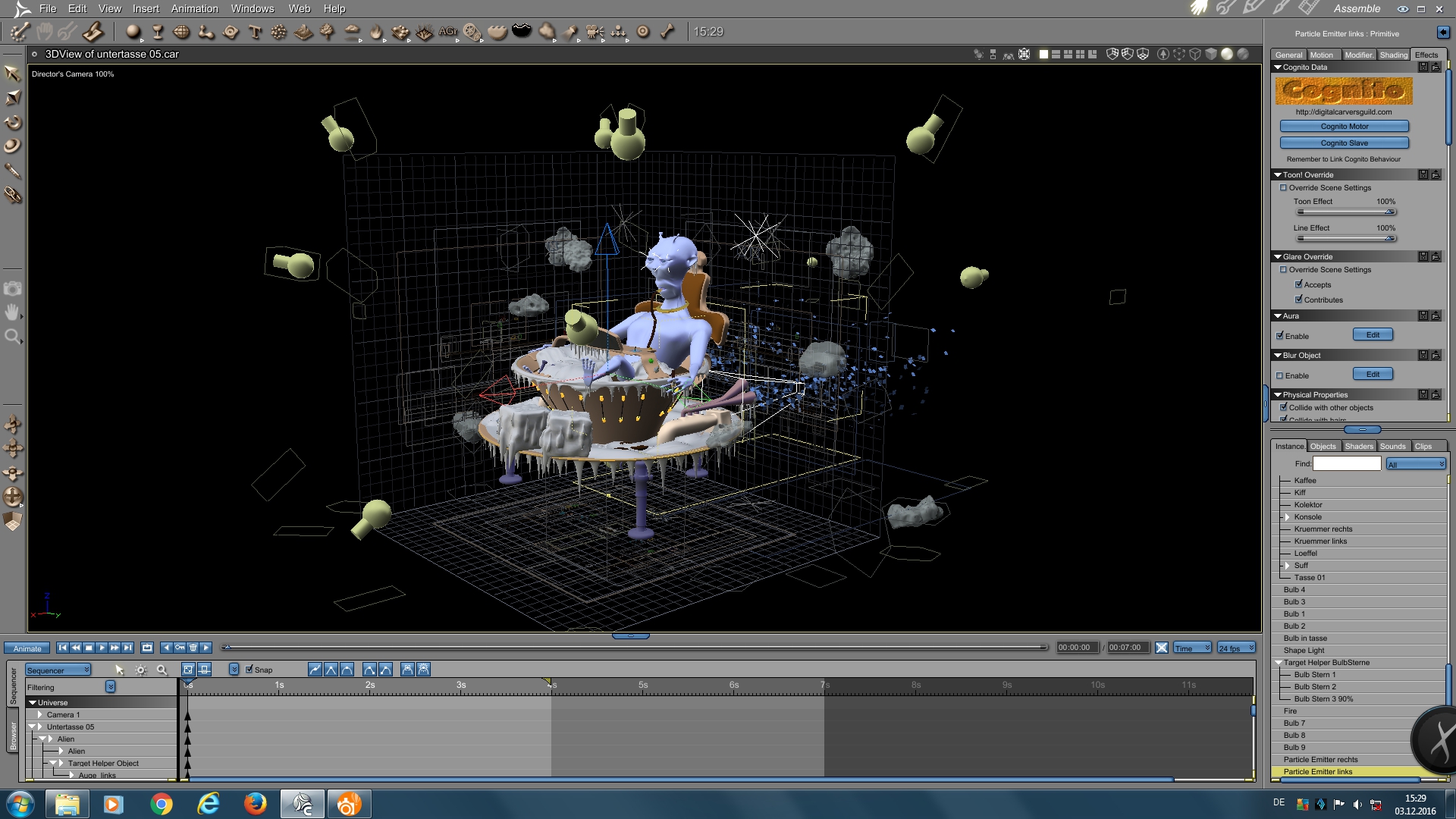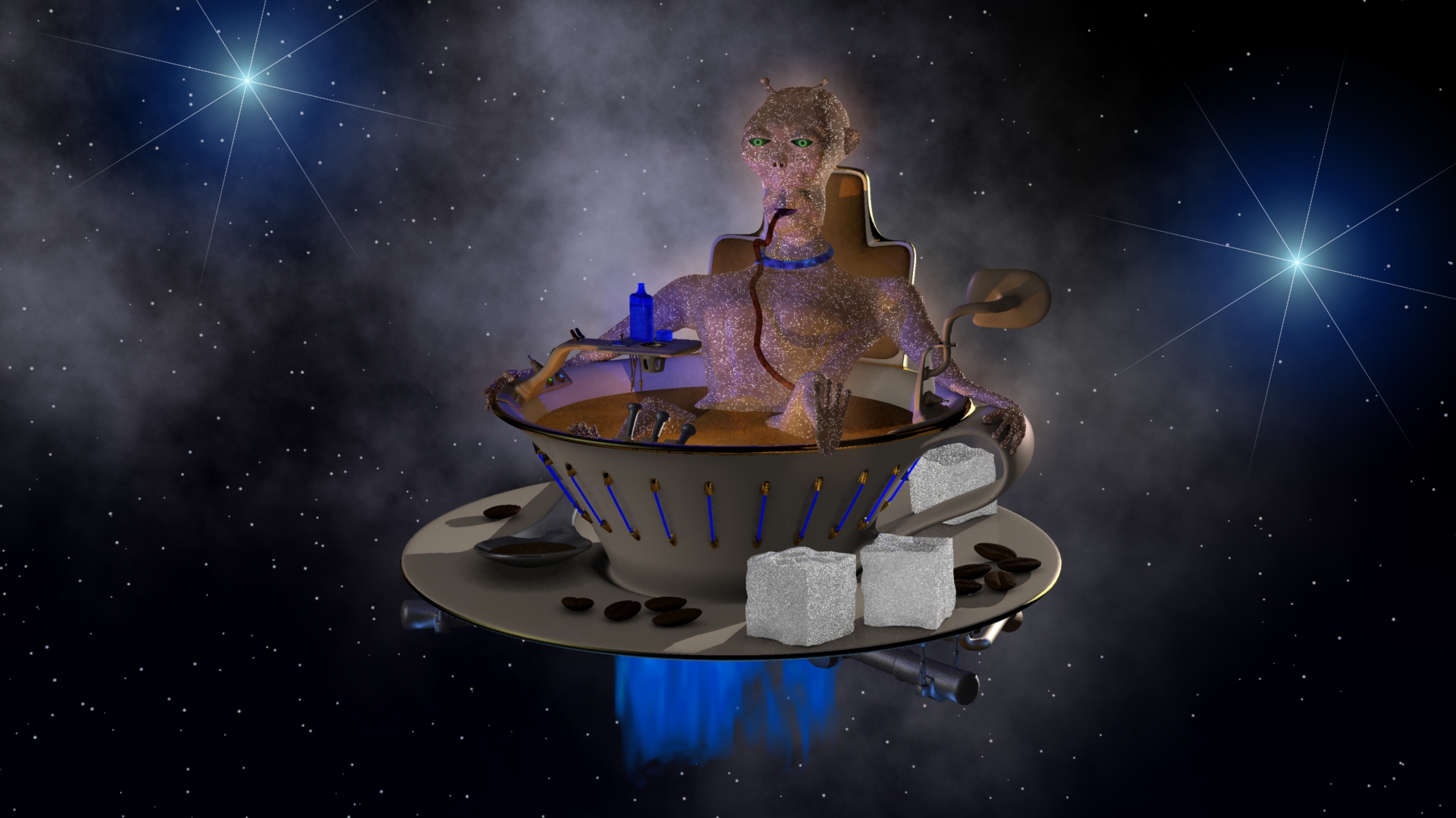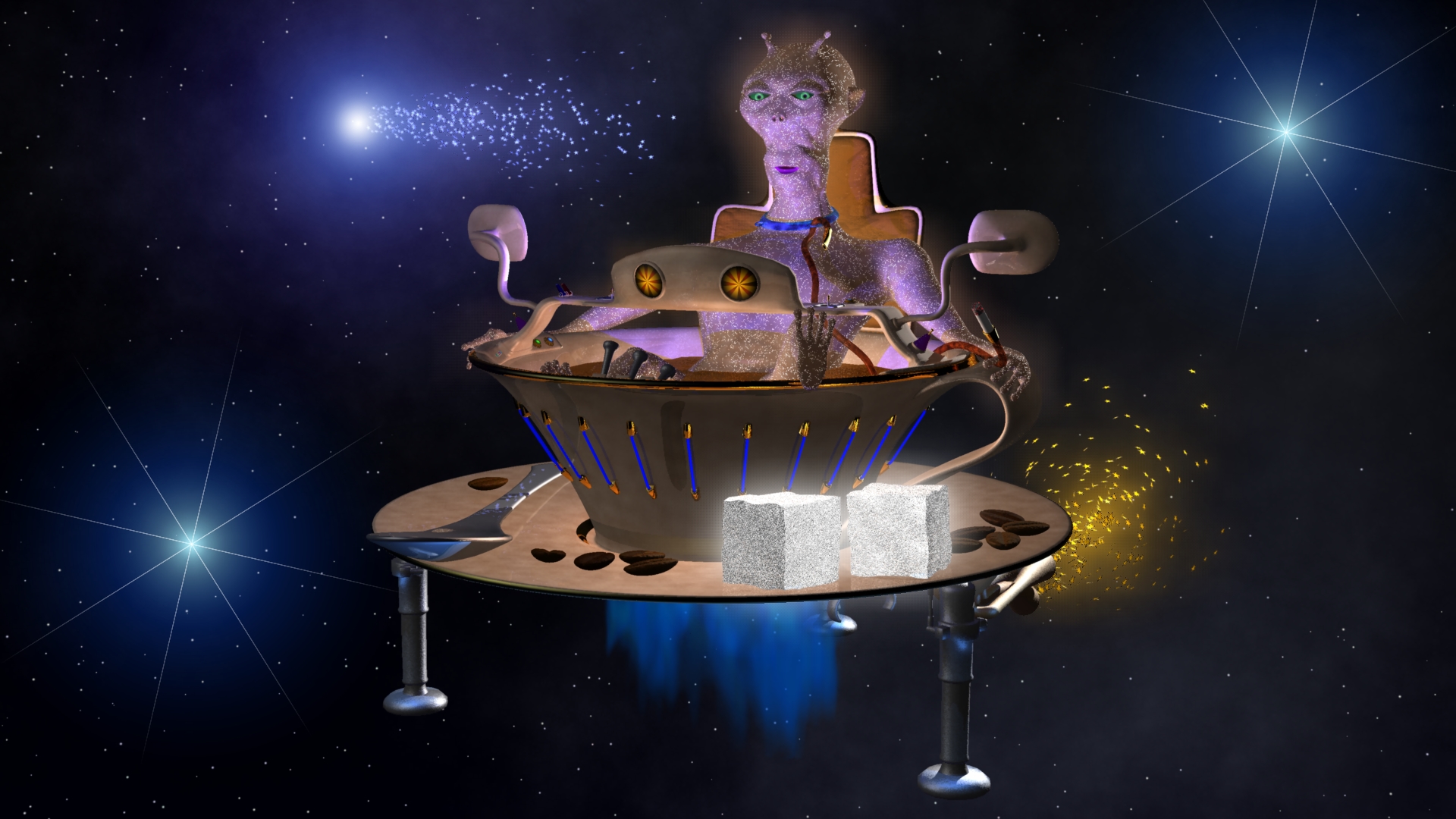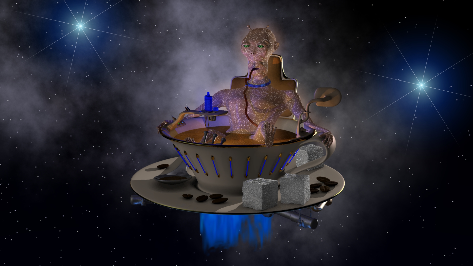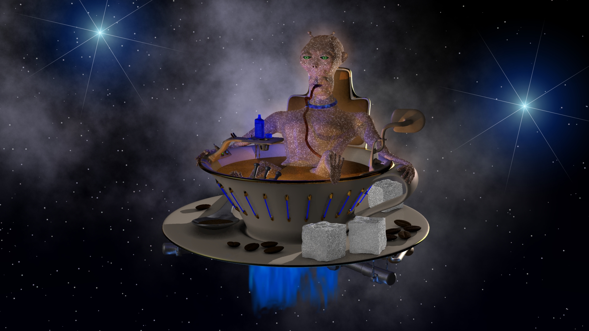 . Hab in Carrara einen kleinen Glow-Mix erstellt und mit Carraras Auraefekt gerendert. Das macht den Zucker "magisch".Hier kommt UT 03 aus unterschiedlichen Blickwinkeln. Die Augen mit Targethelper unt Poitnerfunktion auf die Kamera gerichtet, und die Rotationwinkel der Augen eigeschränkt, damit bei jeder Kamerabewegung der,die,das Alien den Betrachter in Augenschein nimmt. nur bei den Bulbs die den Sternefekt zeigen funktioiert es nich richtig. Das nervt, weil bei jeden Einzelbildrender die entsprechenden Efektquellen nachjustiert werden müssen. Die sollten bei jeder Kamerabewegung immer ihre Position in Richtung Kamera beibehalten. Und im Render sichtbar sein. Die marschieren aber leider in völlig andere Richtungen. Muss ich mir noch was überlegen, wie ich es animationstechnisch gelöst bekomme.