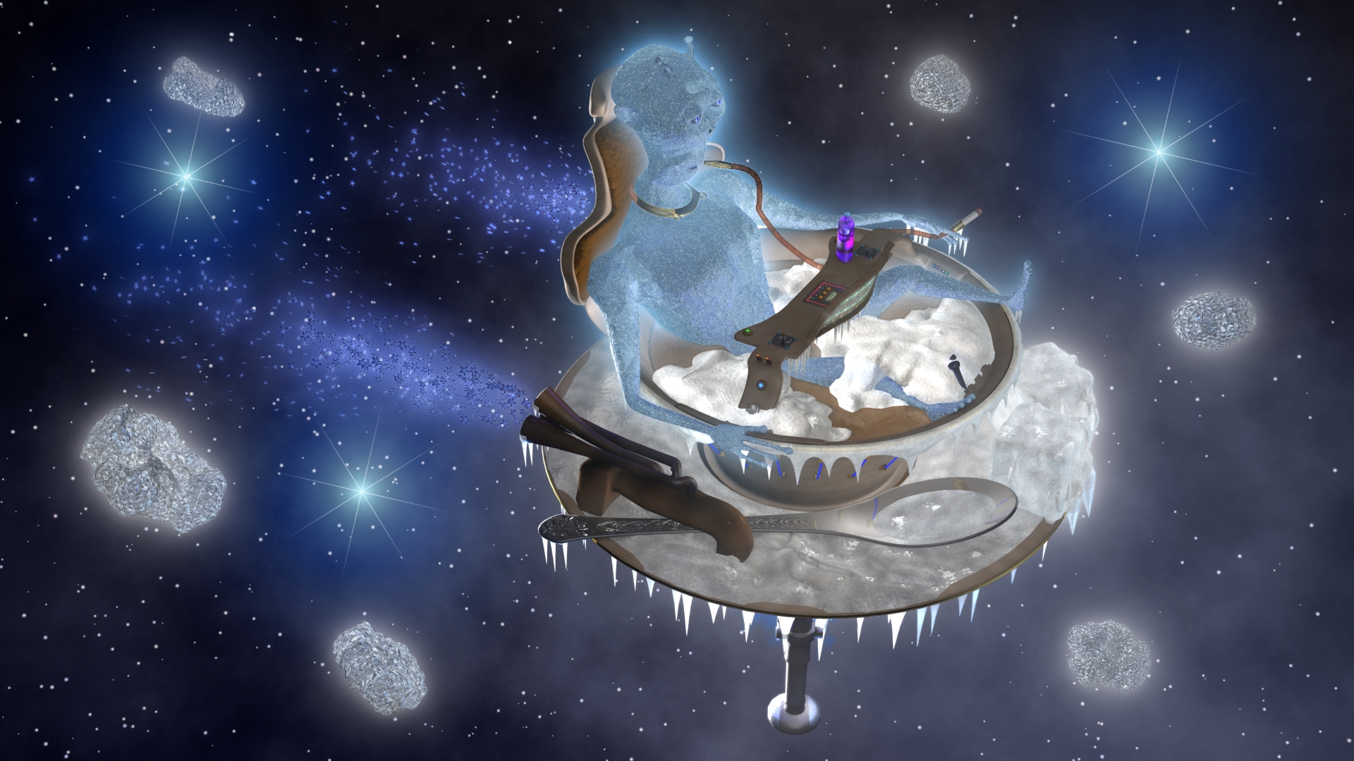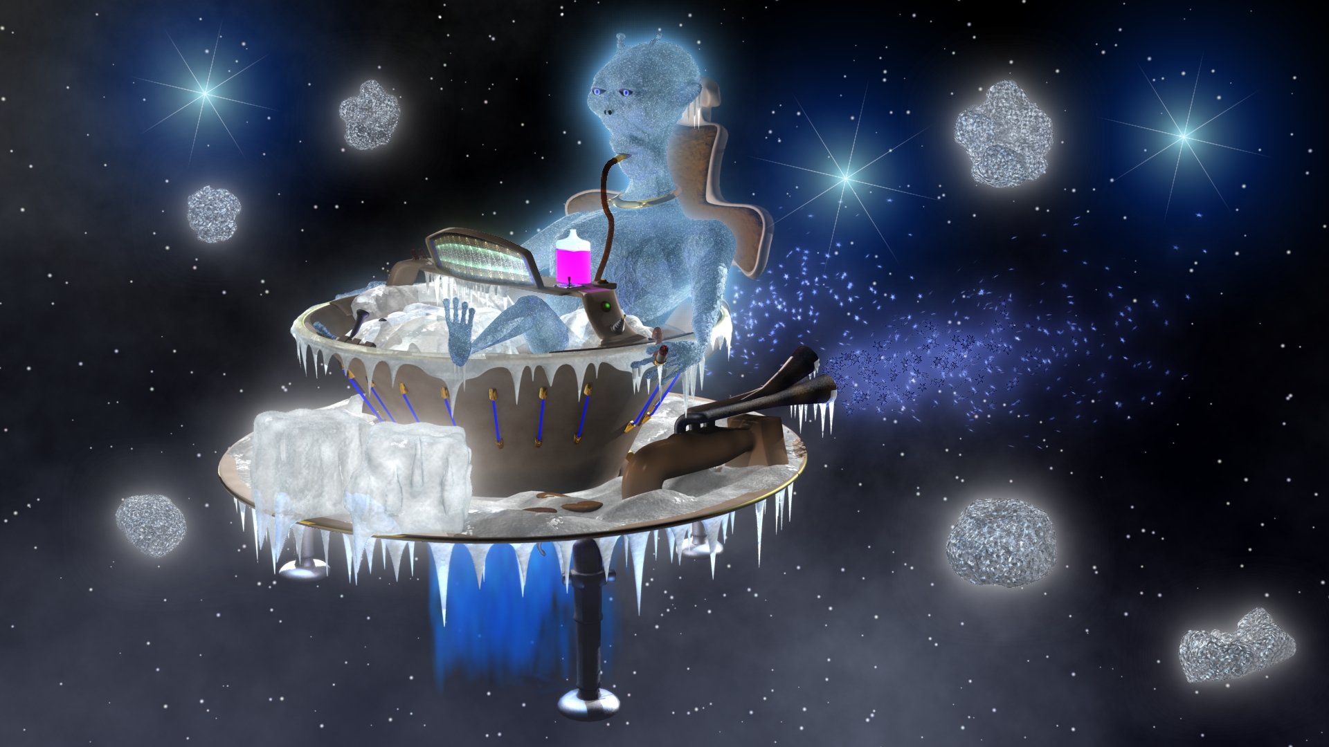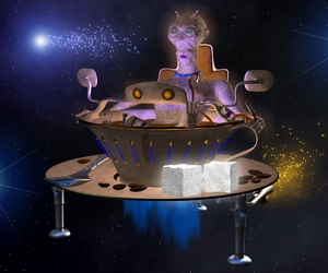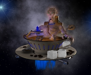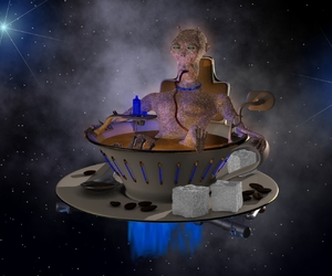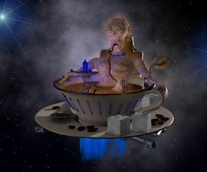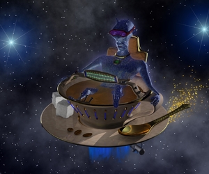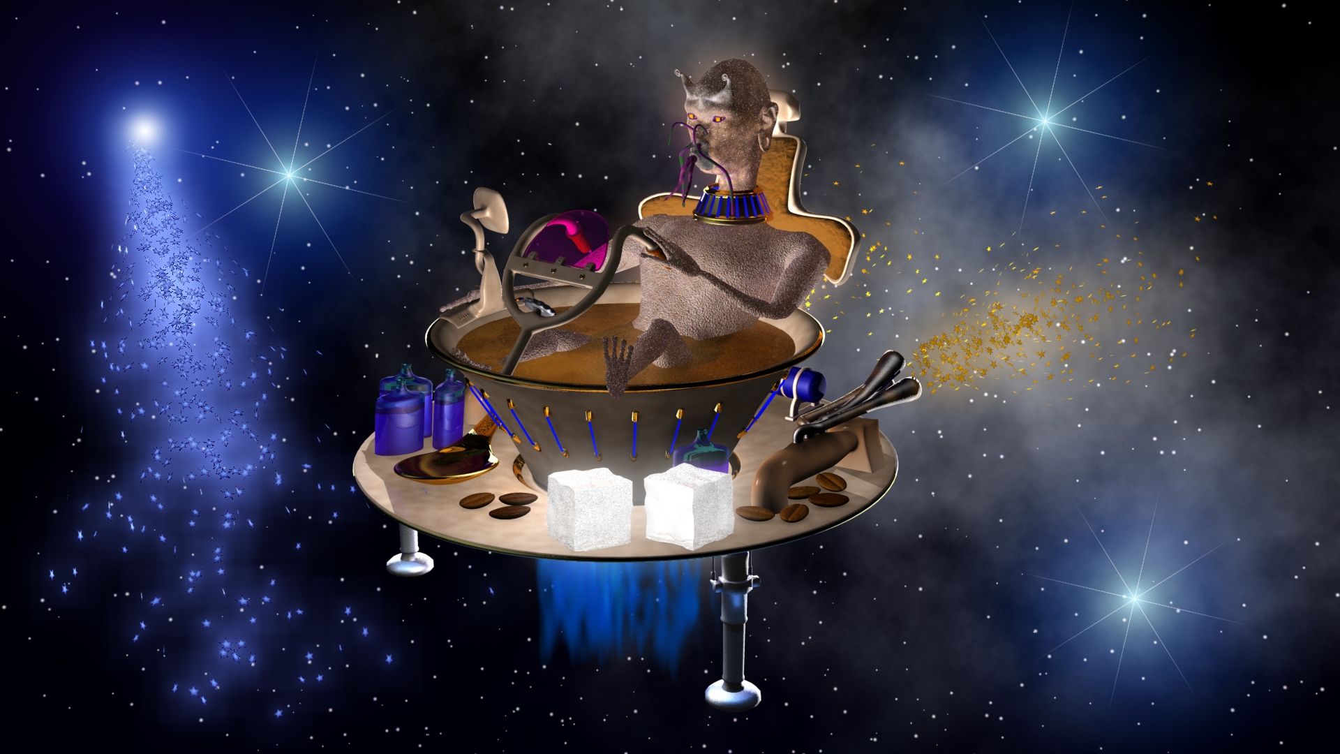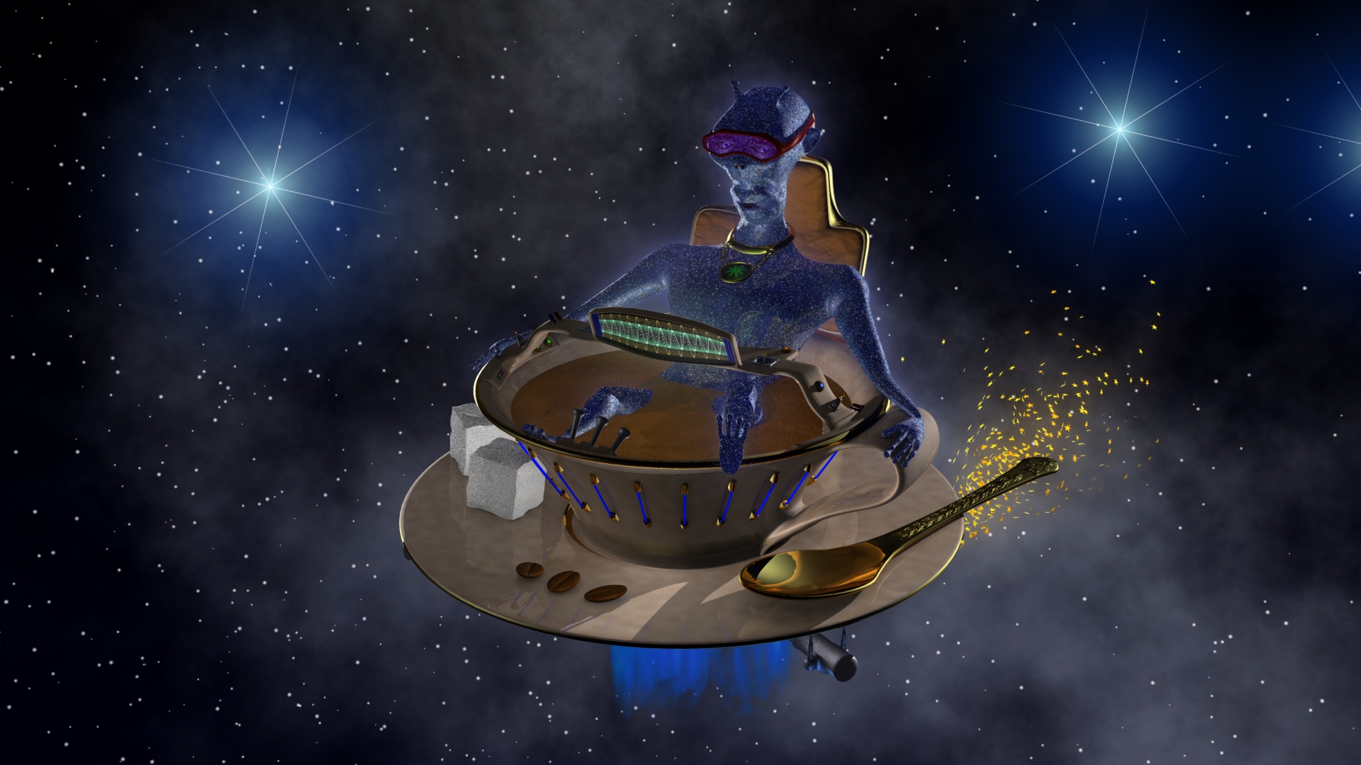 . Hab in Carrara einen kleinen Glow-Mix erstellt und mit Carraras Auraefekt gerendert. Das macht den Zucker "magisch".Hier kommt UT 03 aus unterschiedlichen Blickwinkeln. Die Augen mit Targethelper unt Poitnerfunktion auf die Kamera gerichtet, und die Rotationwinkel der Augen eigeschränkt, damit bei jeder Kamerabewegung der,die,das Alien den Betrachter in Augenschein nimmt. nur bei den Bulbs die den Sternefekt zeigen funktioiert es nich richtig. Das nervt, weil bei jeden Einzelbildrender die entsprechenden Efektquellen nachjustiert werden müssen. Die sollten bei jeder Kamerabewegung immer ihre Position in Richtung Kamera beibehalten. Und im Render sichtbar sein. Die marschieren aber leider in völlig andere Richtungen. Muss ich mir noch was überlegen, wie ich es animationstechnisch gelöst bekomme.