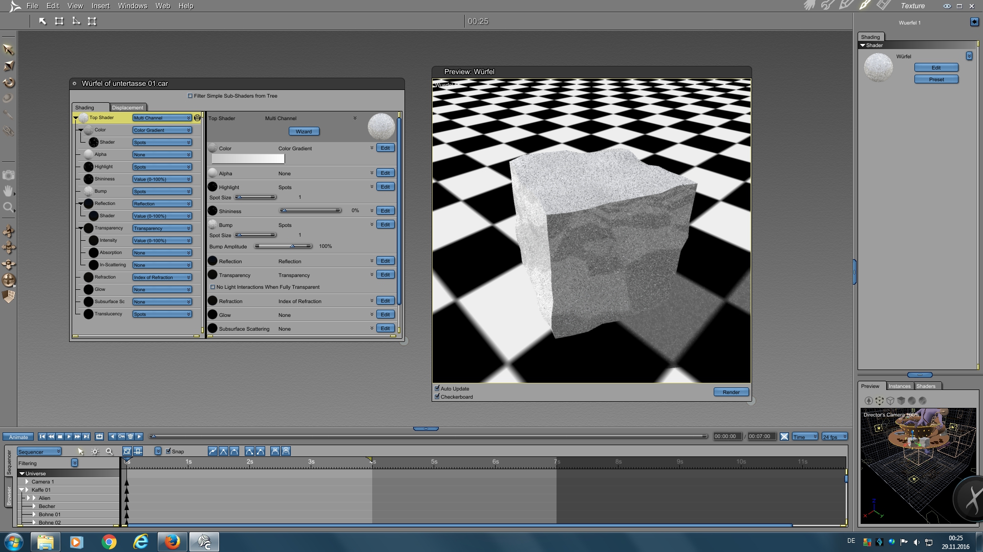 Der mich störende quadratische helle Fleck an der Rücklehne kommt auf Grund der Spiegelung zustande. Ich hoffe nicht, das ich auf die Spiegelung der Tasse in der Anima verzichten muss. Das wär blöd.