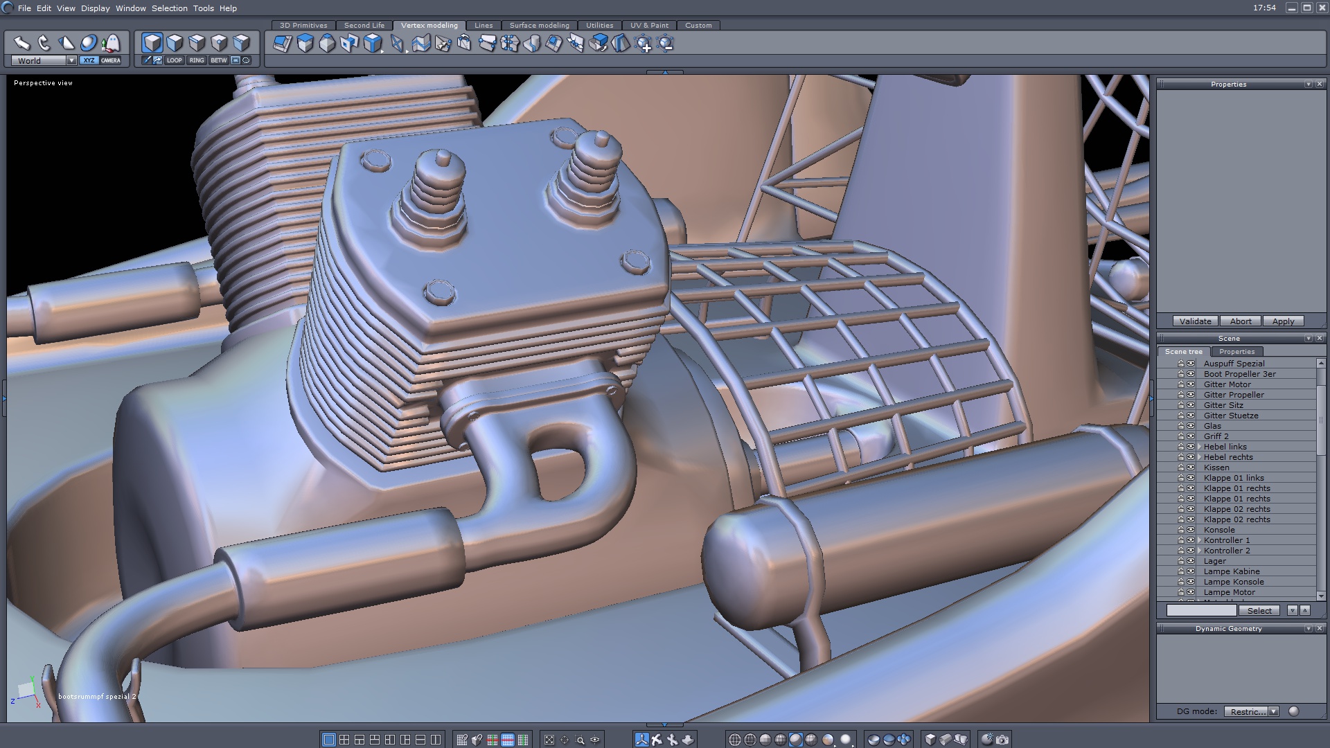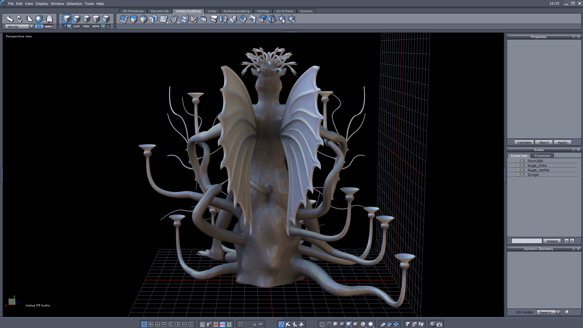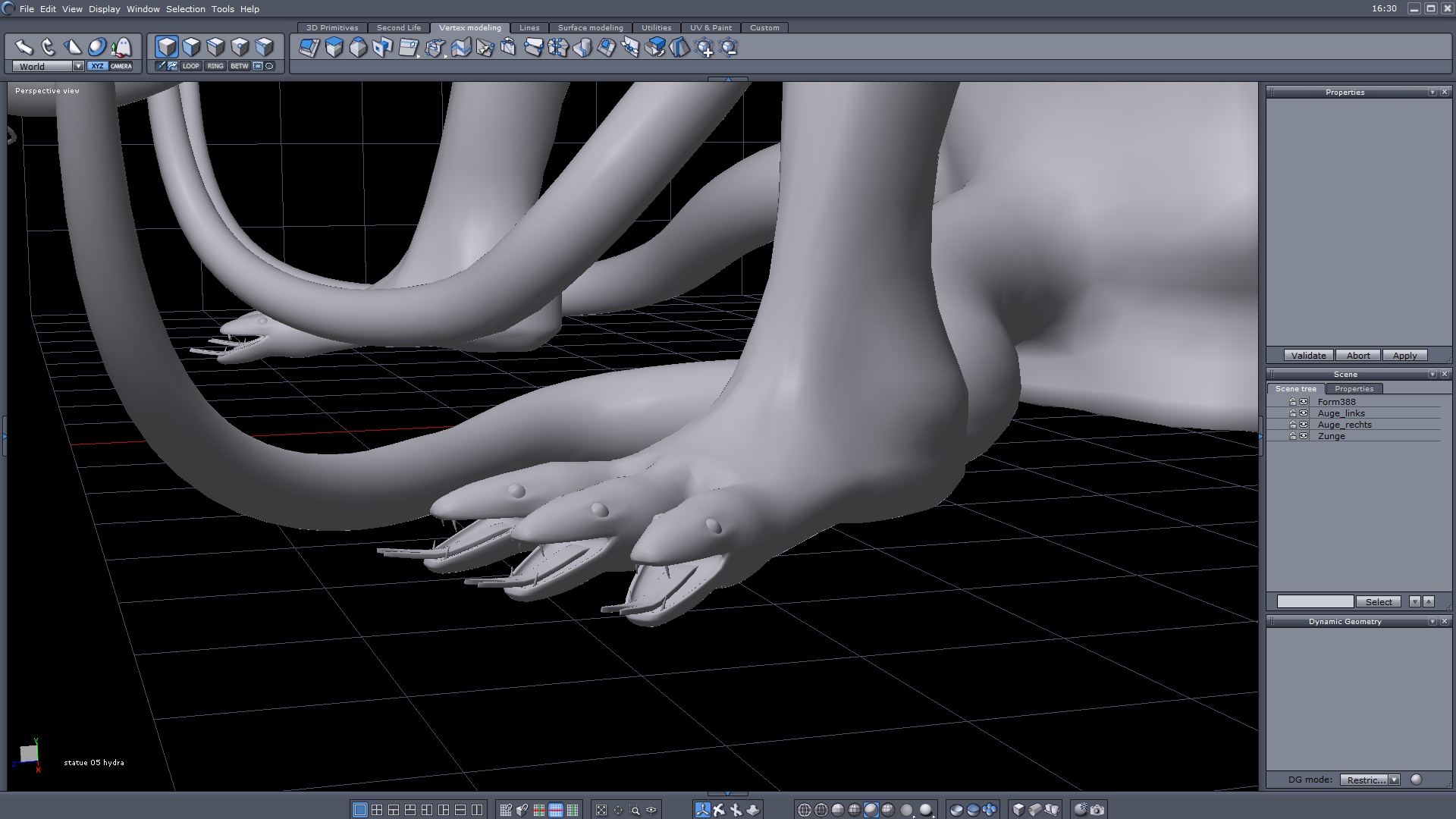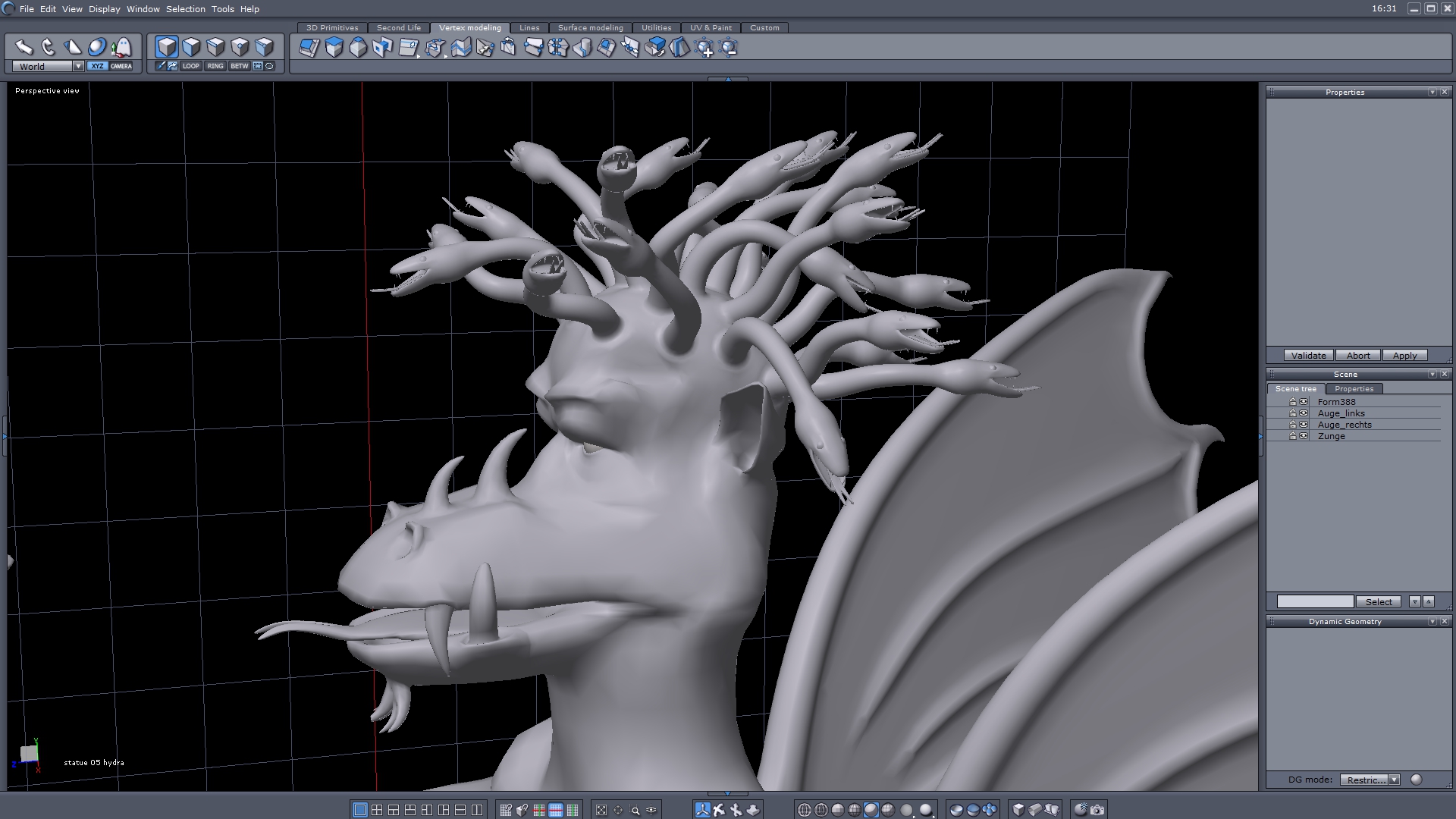 Kushanku: In einer Hexagonversion wurde die Polygonzahl mal angezeigt, musste in den Propertries festgelegt werden. War dann im Modlingfenster rechts unten sichtbar. Und es gab mal ein Lineal mit Scalenunterteilung. War,..... glaub ich die erste Hexagonversion. Und mit der Weiterentwicklung von dem Programm wurde auch einiges entfernt. Das "Lineal" existiert in einer abgewandelten Form, hat mir bisher nicht wirklich geholfen. Um spezielle Winkelpositionen zu messen hab ich mir mal einen Virtuellen Winkelmesser für alle drei Achsen erstellt. Ist aber nur ortogonal ratsam zum messen.