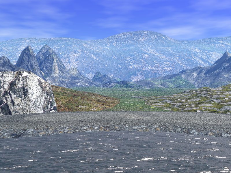 An den Gebirgen im Hintergrund habe ich gearbeitet, aber es ist anscheinend ganz schön schwer, eine Tex zu finden, die auf so einem zinnenartigen Berg wirklich gut aussieht...