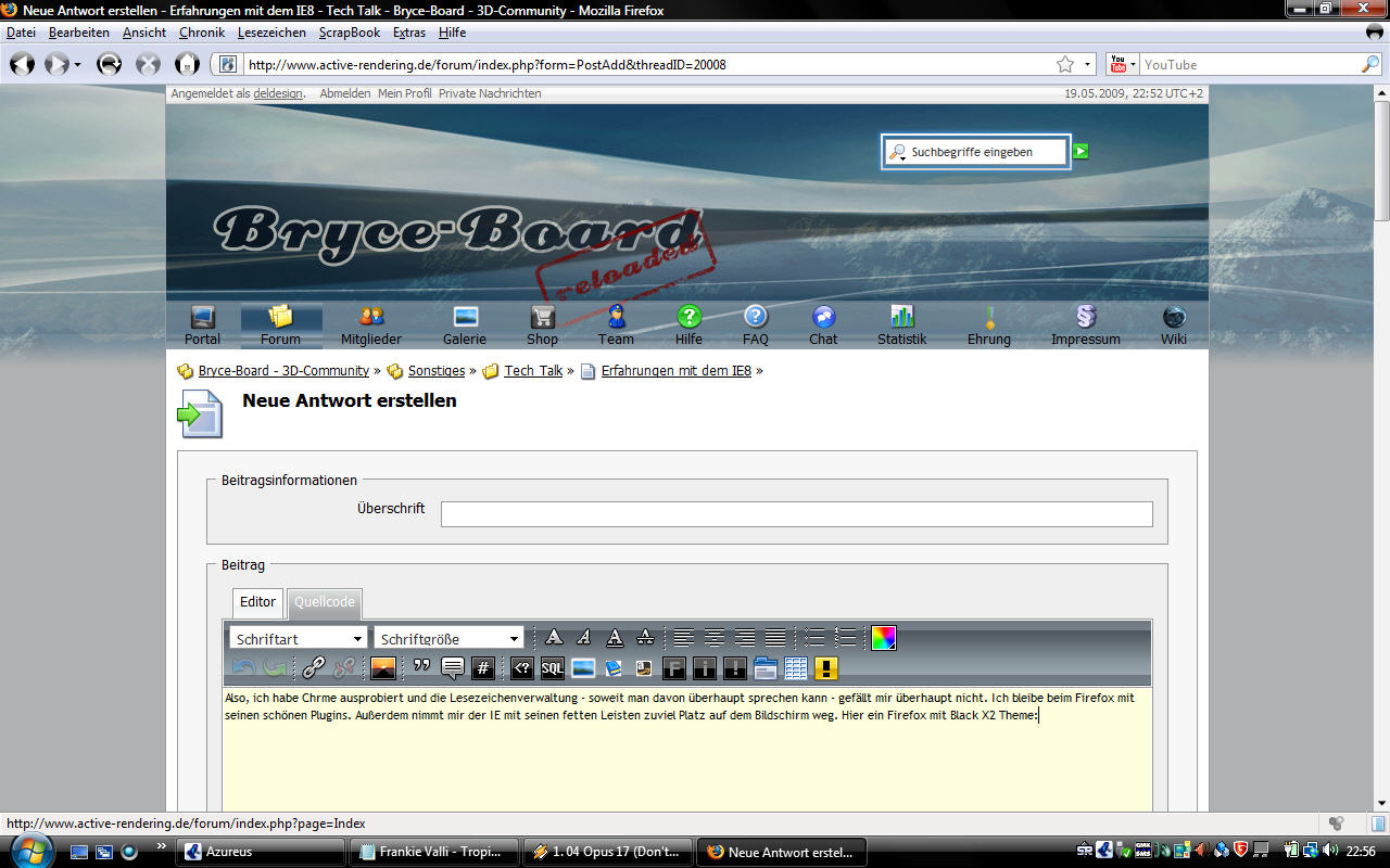 Also, ich habe Chrme ausprobiert und die Lesezeichenverwaltung - soweit man davon überhaupt sprechen kann - gefällt mir überhaupt nicht. Ich bleibe beim Firefox mit seinen schönen Plugins. Außerdem nimmt mir der IE mit seinen fetten Leisten zuviel Platz auf dem Bildschirm weg. Hier mein Firefox mit Black X2 Theme: