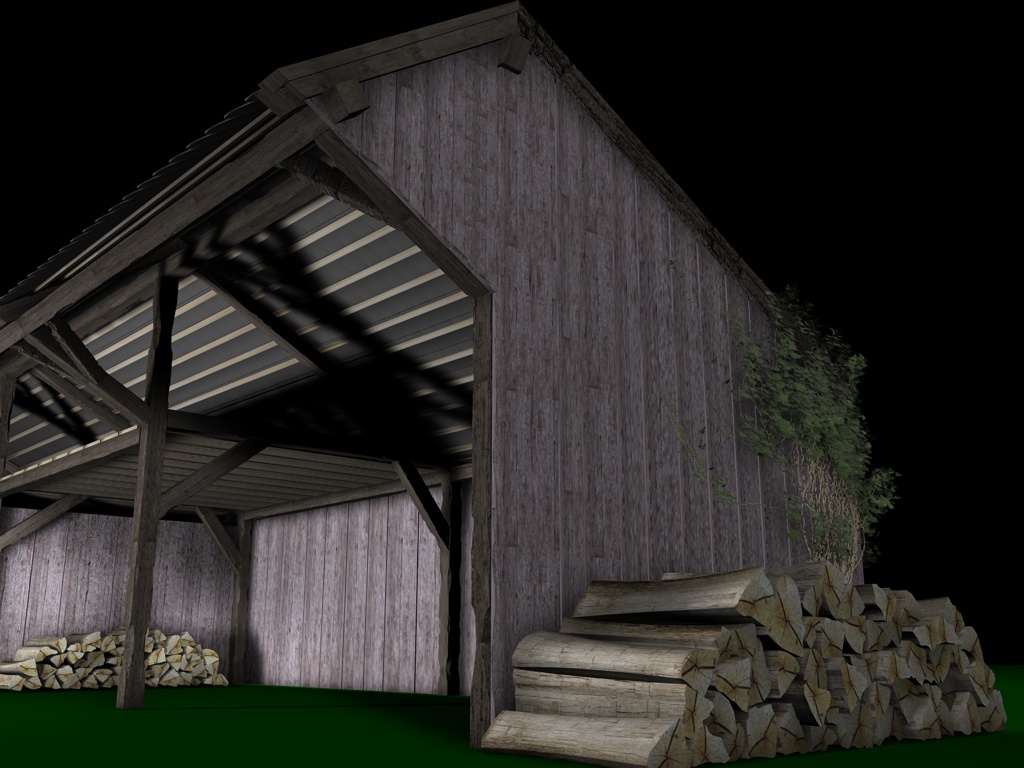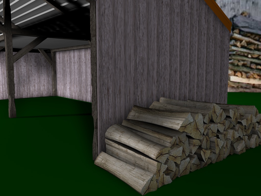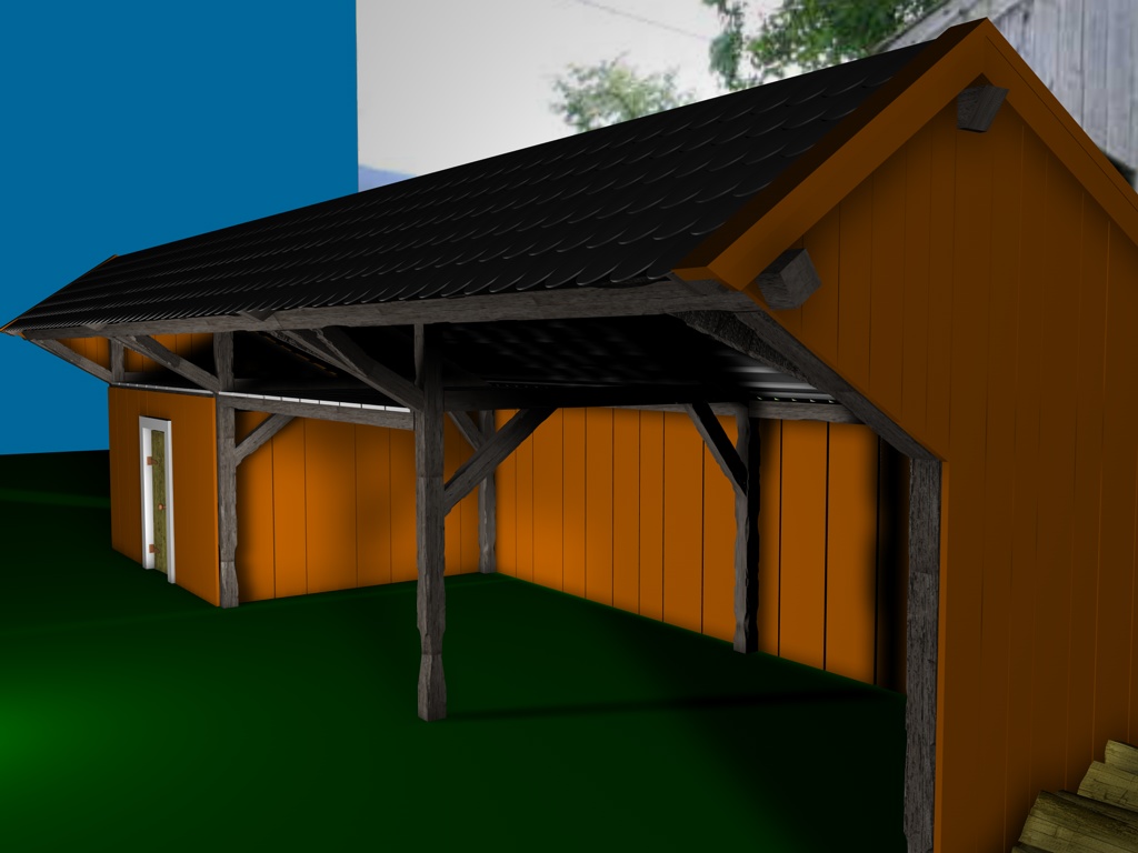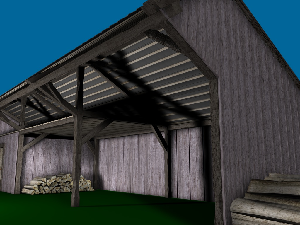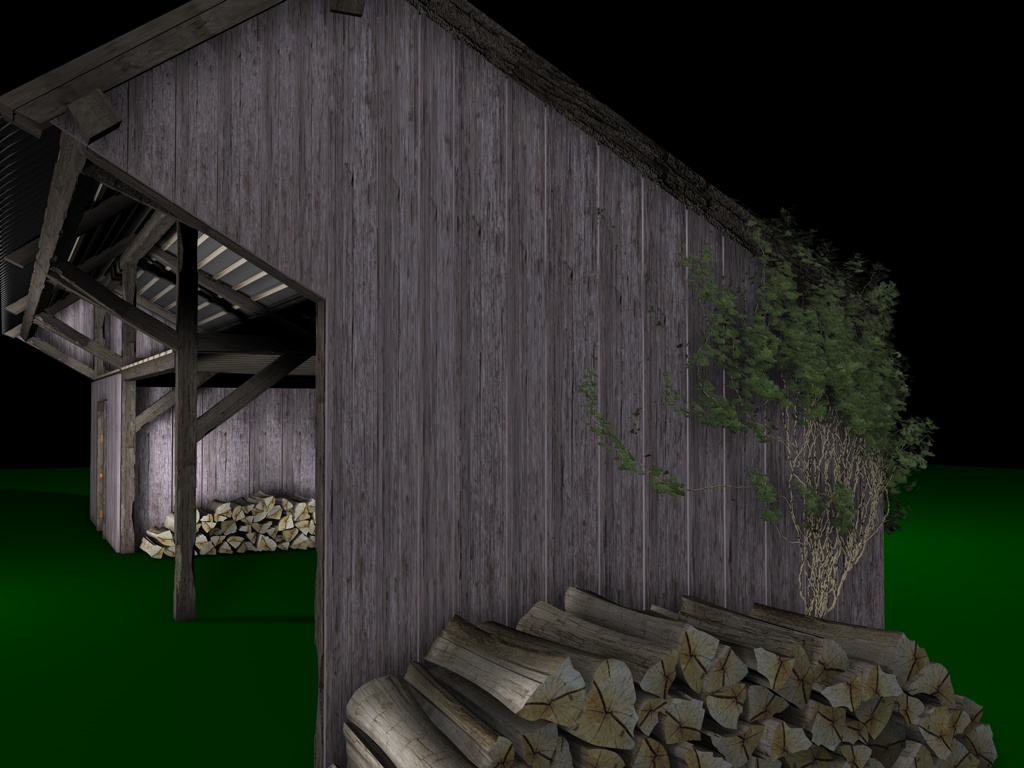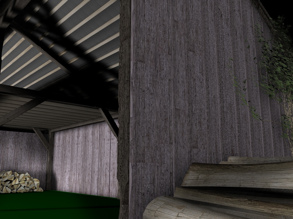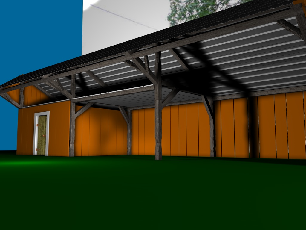 Mir gefallen die Wände noch nicht, die sehen jetzt im Vergleich zu den Balken, der Tür und den Scheiten zu glatt aus, uns an das Dach traue ich mich noch gar nicht zu denken; ich hätte dort auch gern eine leichte Durchbiegung zur Mitte hin wie auf dem Foto. Und die Dachziegel sehen einfach noch grauenvoll aus, die oberste Reihe besteht aus einem 60x geklonten Ziegel, die andern Reihen sind Instanzobjekte davon, es ist mir noch nicht gelungen mit irgendeiner der Pjojektionsmethoden eine vernünftige Textur darauf zu bekommen.