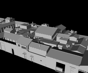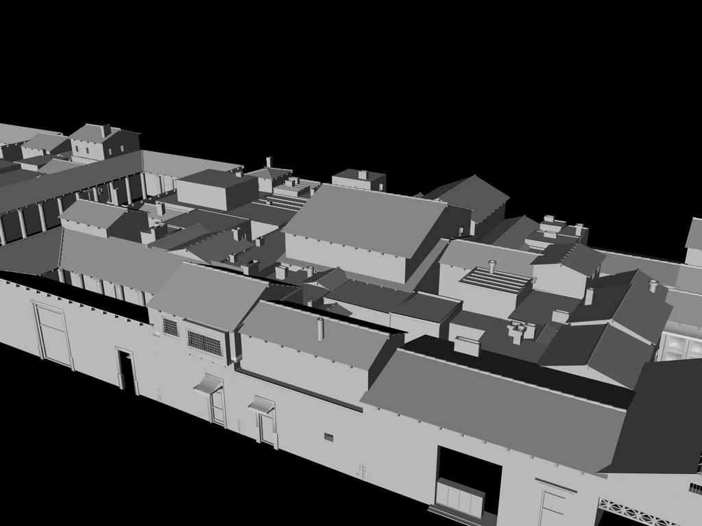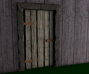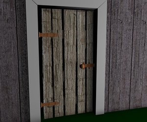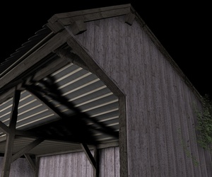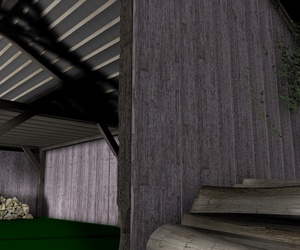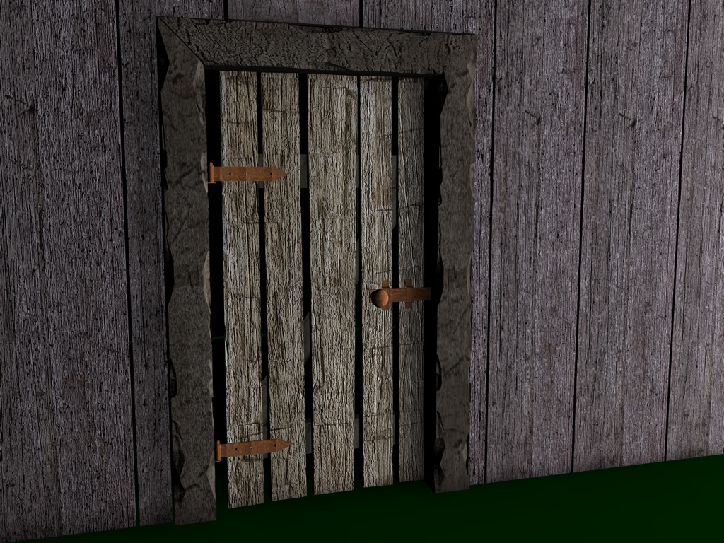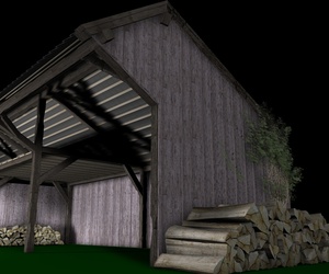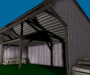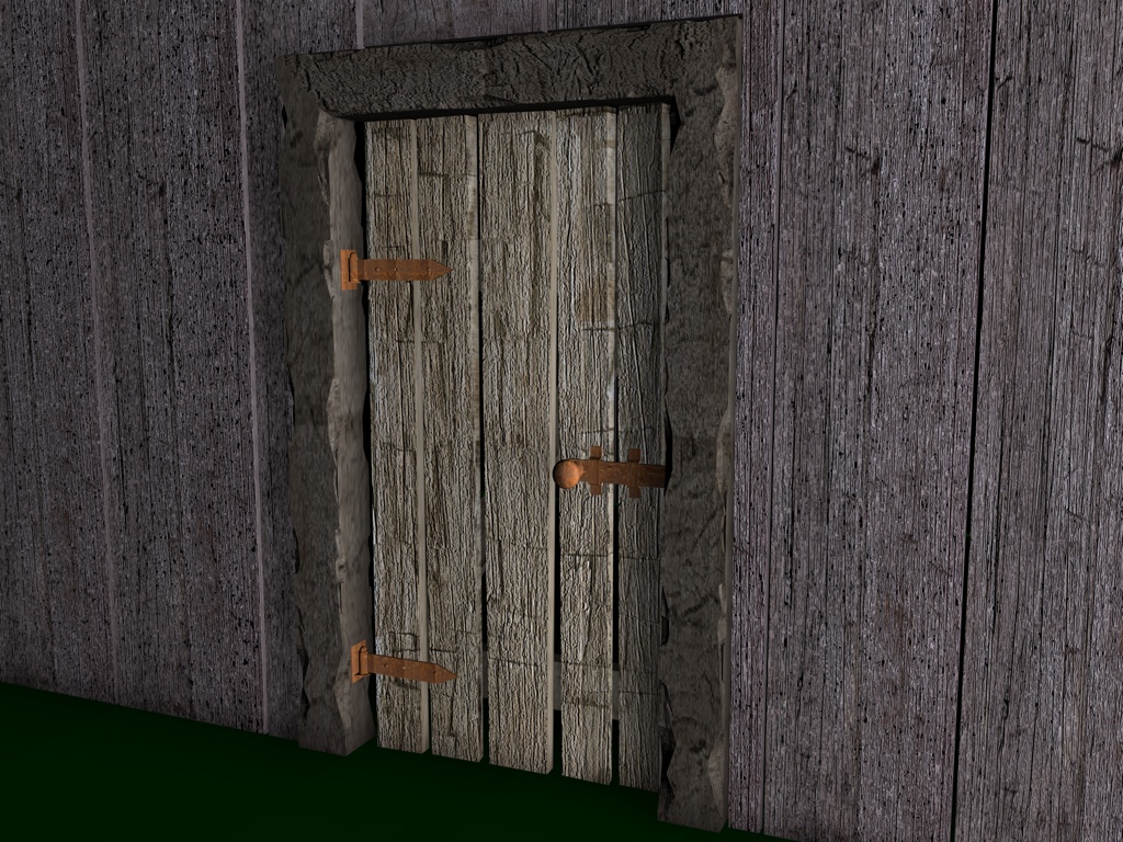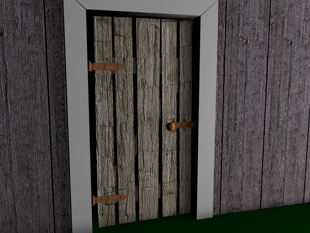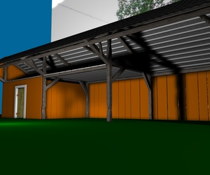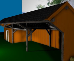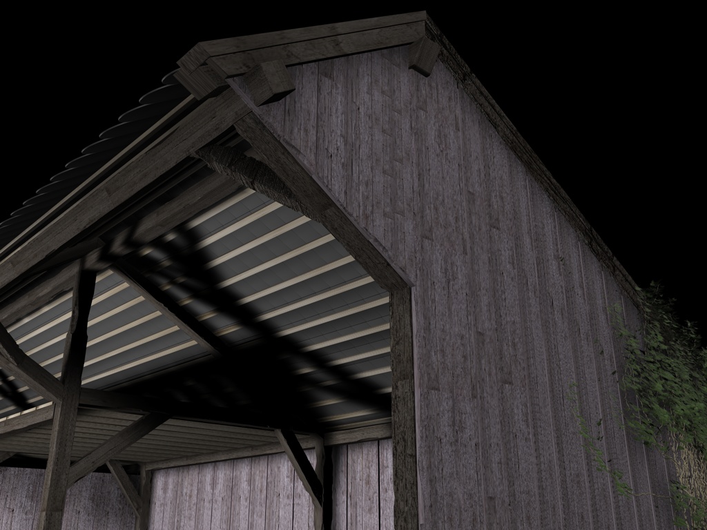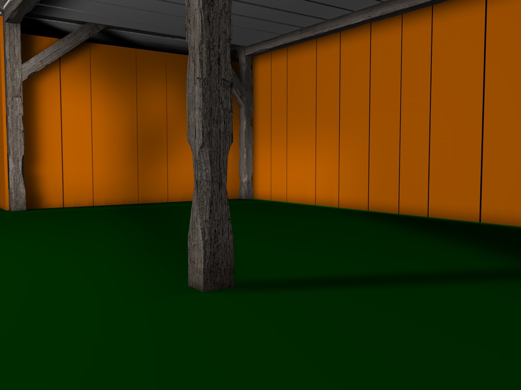 Mir gefallen die Wände noch nicht, die sehen jetzt im Vergleich zu den Balken, der Tür und den Scheiten zu glatt aus, uns an das Dach traue ich mich noch gar nicht zu denken; ich hätte dort auch gern eine leichte Durchbiegung zur Mitte hin wie auf dem Foto. Und die Dachziegel sehen einfach noch grauenvoll aus, die oberste Reihe besteht aus einem 60x geklonten Ziegel, die andern Reihen sind Instanzobjekte davon, es ist mir noch nicht gelungen mit irgendeiner der Pjojektionsmethoden eine vernünftige Textur darauf zu bekommen.