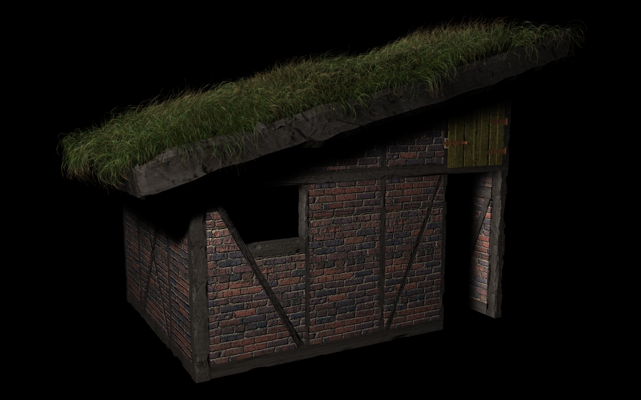 So, ich hab jetzt mal die Eintrübung beim Sky - Objekt von 35 auf 20 % runtergeschraubt und den Boden vor dem Stall etwas dunkler gemacht und mit Glanzlicht versehen.