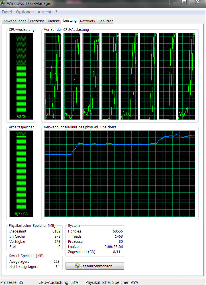 Es geht sogar mit 64! Allerdings mache ich das mit Cinema, die Figuren sind mit InterPoser importiert. Was da an Arbeitsspeicher extra gebraucht wird, kommt aus der Auslagerungsdatei. In meiner virtuellen Bar mit Figuren mit Haaren bin ich schon auf 6 GB + 8,5 Auslagerungsdatei = 14,5GB gekommen.