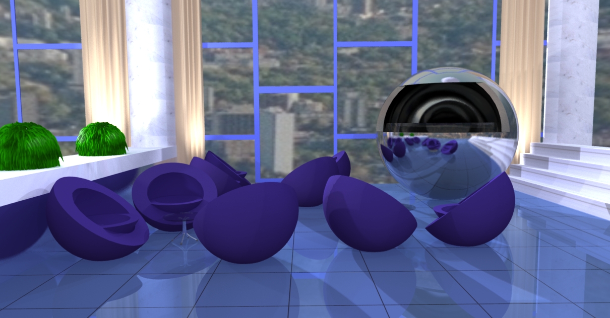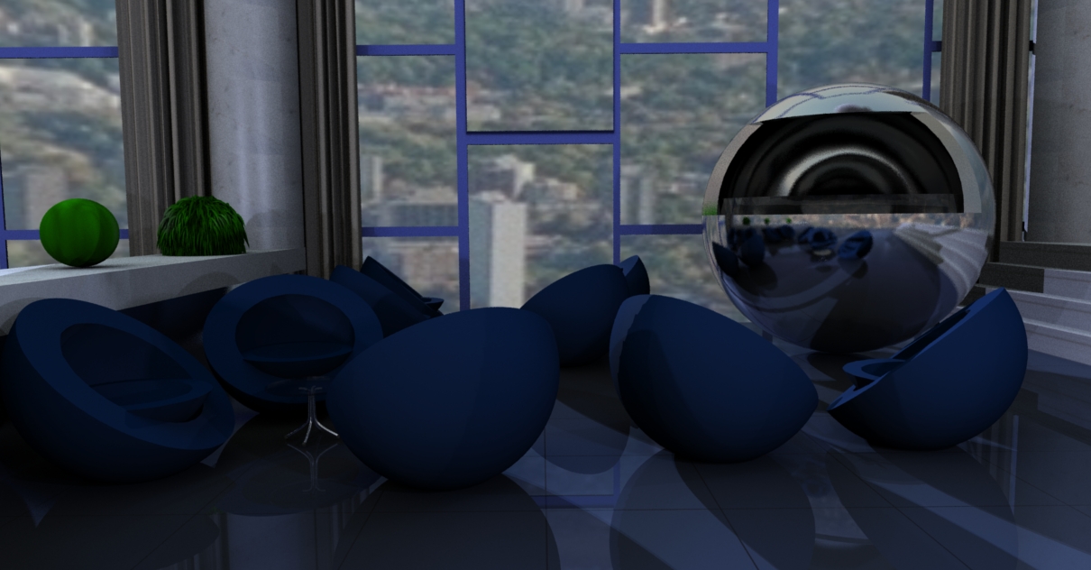 Damit sich in der dicken chrom kugel das bild der hinteren stühle, die man nicht sieht spiegelt, muss ich auch das dahinter liegende, dass logischerweise nicht im Blickfeld ist erstellen. Sobald ich wieder weiter bin, gibts neues screense2: