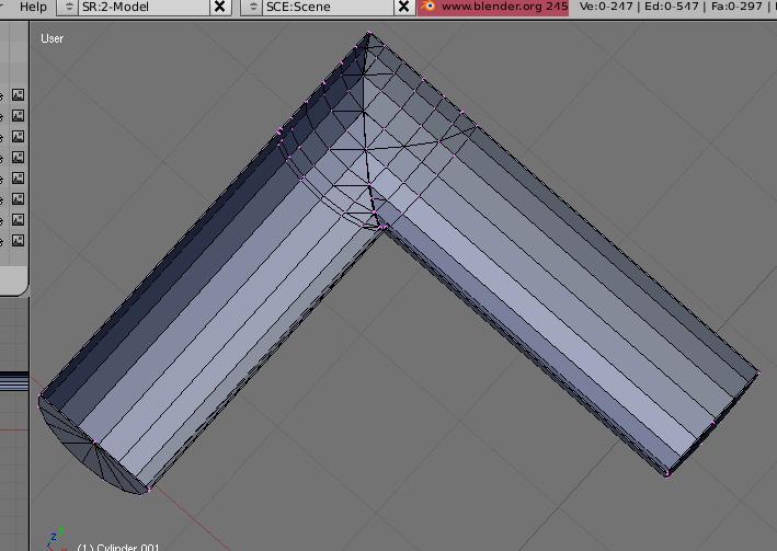 Da das Board vorhin wiedermal nicht erreichbar war, hab ich selbst mit meinen bescheidenen Kenntnissen gefrimmelt. Hab 2 Zylinder erstellt (jeweils im Objekt mode), die obere Hälfte gelöscht, etwas skaliert, die faces an den Enden, wo die Zylinder zusammen kommen gelöscht und die Zylinder in Position gebracht. Dann hab ich jeweils im edit-mode mit ctrl-r paar edges gemacht (immer da, wo beim anderen Zylinder die edges sind) und hab dann die quads in mühevoller knife-Arbeit geteilt (durch deinen 2.Link bin ich jetzt schlauer, wie das schneller geht). Und hab dann alle überstehenden quads und triangles gelöscht. Hab dann beide Zylinder noch mit dem einem Script (solidify selection) ganz leicht nach innen extrudiert, weil ja Regenrinnen nicht so dünn sind wie Papier. Und am Schluss hab ich beide gejoint. Hab jetzt dafür bald ne Stunde gebraucht!! Bin grad erschrocken, als ich auf die Uhr gesehen hab. Mir ist es nämlich nicht so lang vorgekommen.