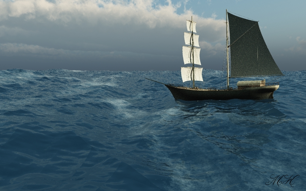 Das ist das "Default Water" von den MetaWaters (unter Liquids).Das Schiff is nu weiter rechts. Hab ausserdem die Kamera etwas tiefer gemacht. Das Wasser scheint nur so, als ob es nich weit is. Das kommt von den Wellen, da kann man nich drübergucken