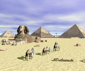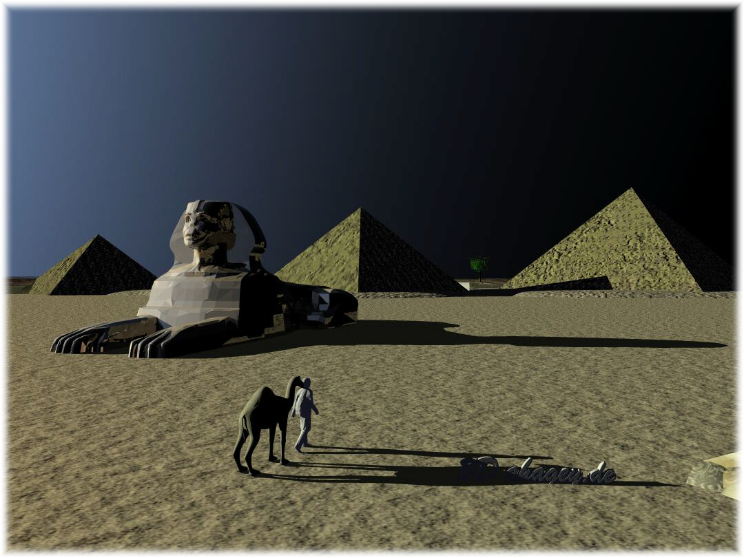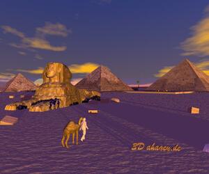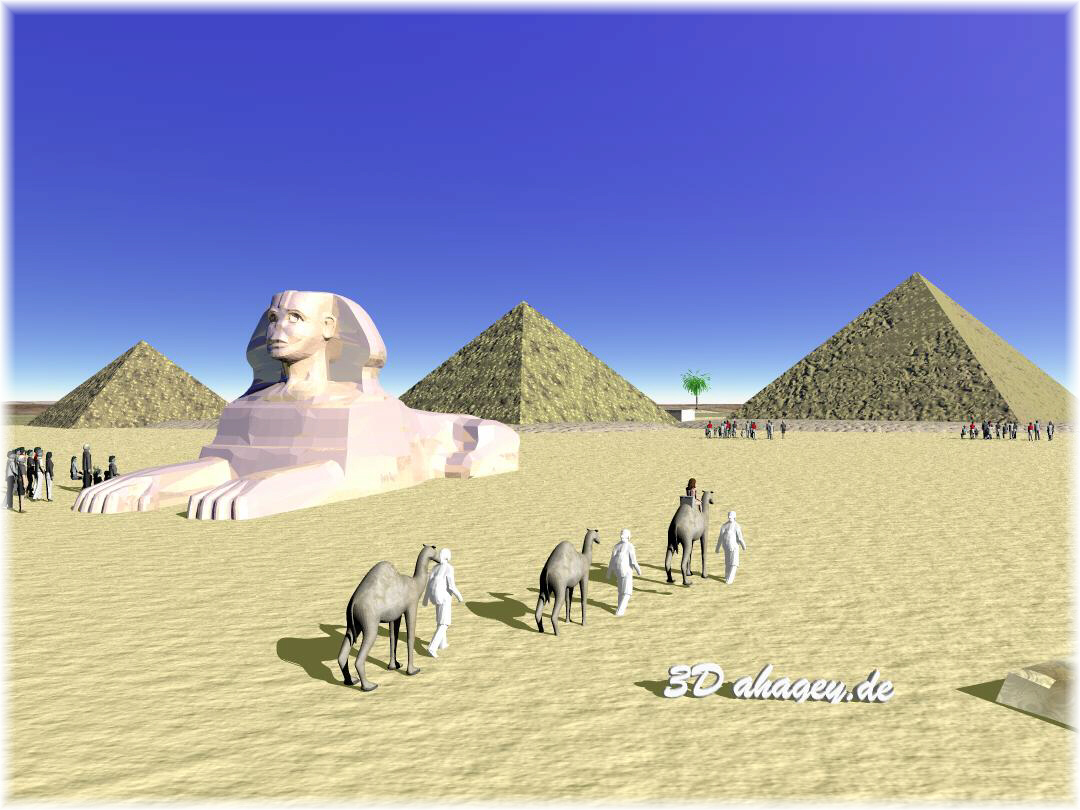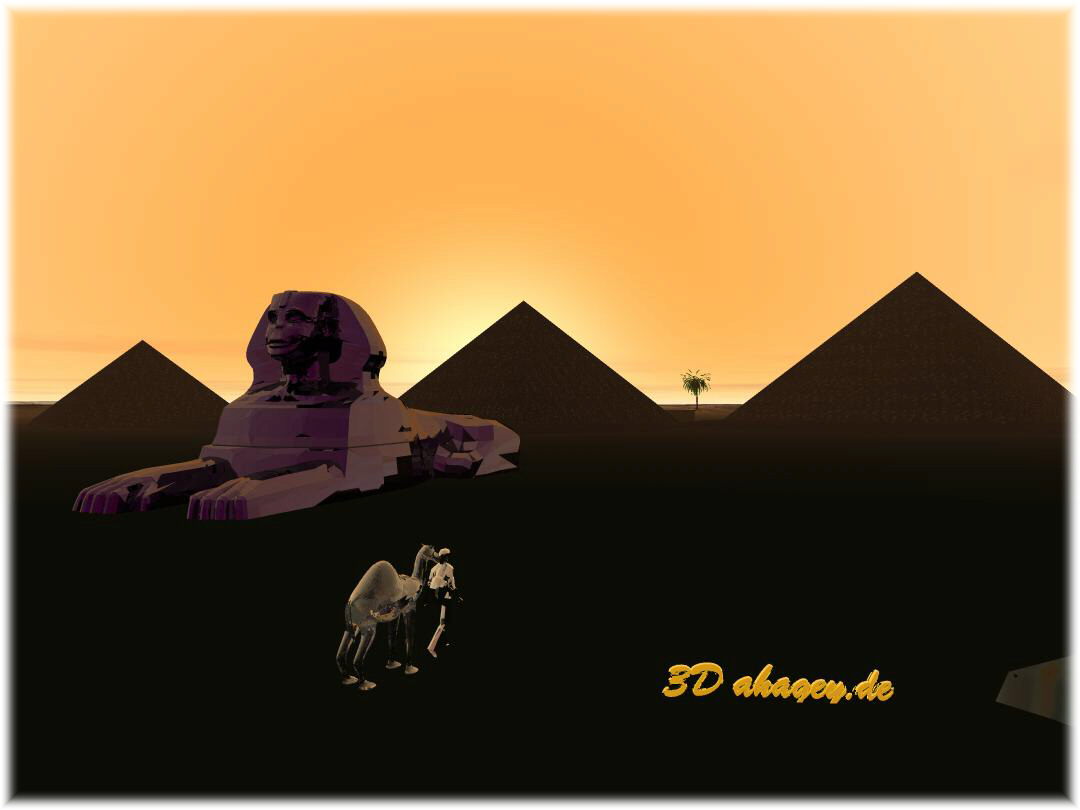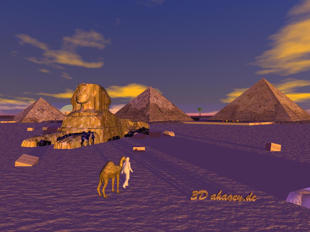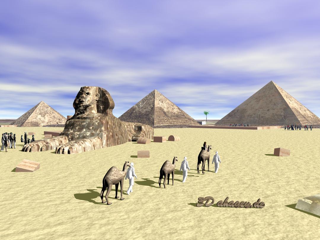 Die Texturen der Pyramiden habe ich nochmal überarbeitet, jetzt mit Orginalfototextur. Fotografien (als "Echtheitsbeweis" eine Postkarte aus dem 2ten Weltkrieg! );), geänderte Bilder und Link habe ich angehängt. Bei der Sphinx, oder heißt es "der Spinx" weil es sich um einen Pharao handelt ?(, ist es sehr schwierig, trotz Orginalfototextur, eine eingermaßen gute Sandsteintextur zuerstellen. Dazu müsste man wohl die Sphinx zerschneiden und das ist mir noch nicht gelungen ![]()