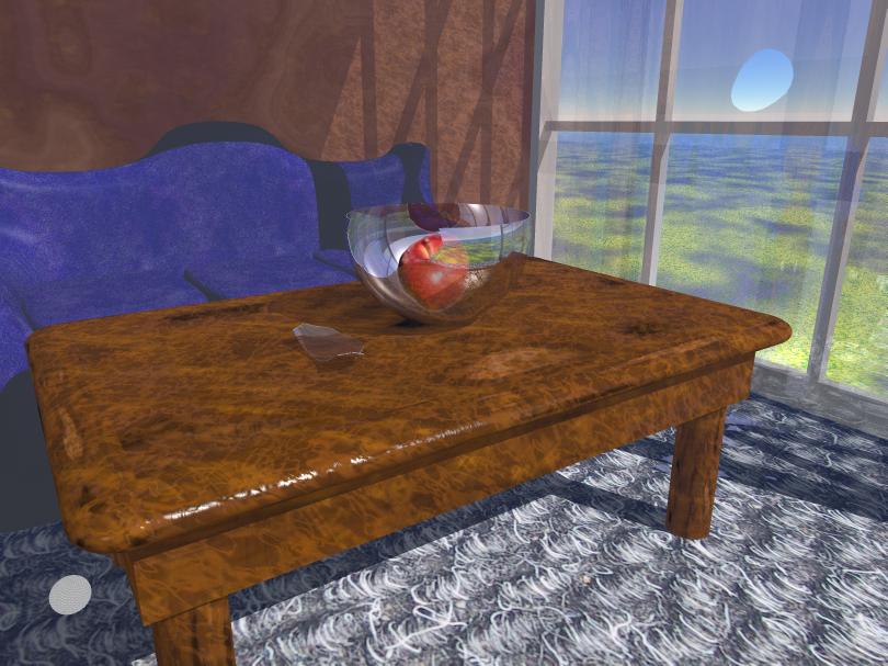 Dieser ist mit hoher Geschwindigkeit durch das rechts vom Tisch (mit zu grosser Textur) befindliche Fenster gedonnert, hat dabei an Geschwindigkeit verloren, die Schale getroffen und ist auf den Teppich (in Amerika gibt es tatsaechlich solche Teppiche mit solcher Textur) gefallen. Die Scherben der Fensterscheibe liegen noch auf dem Teppich, sind aber wegen fehlender Lichtreflexe schlecht zusehen. Gardinen gibts keine. Es scheinen Spieglungen zu sein.Dank fuer Deine Kritik und Gruss