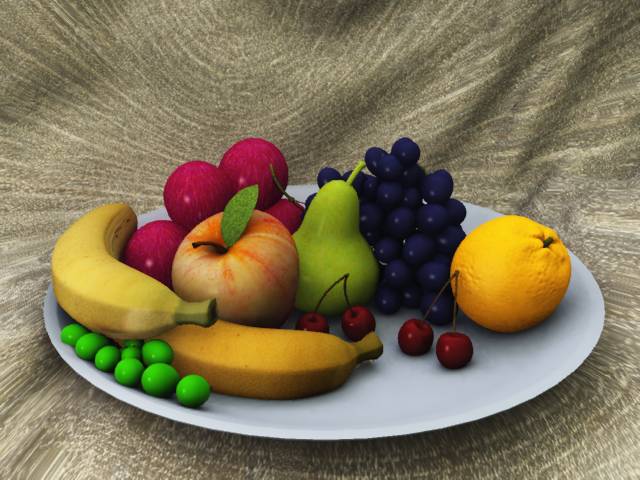 Bananen, Apfel, Kirschen sind Bildtexturen, selbst erstellt. Alle anderen Materialien sind prozedurale Texturen. Bei den Beeren bin ich noch nicht ganz zufrieden.