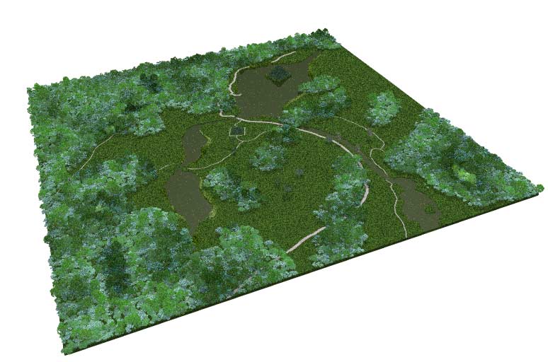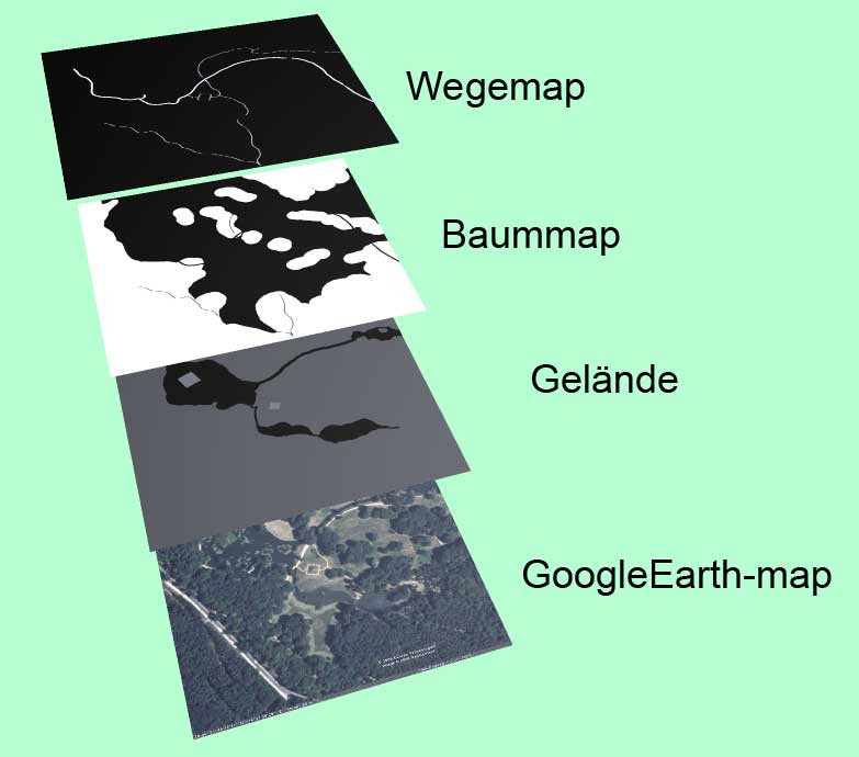 erster Versuch aus einem GoogleEarth-Bild eine Landschaft zu formen. Aus dem Sat-Foto wurden verschiedene Maps generiert die zur Erzeugung der Landschaftselbst dienten und zur Steuerung des Ecomats benutzt wurde.