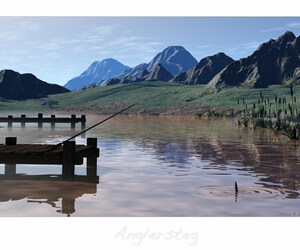 So, das hat nun etwas länger gedauert, aber nun habe ich es doch noch geschafft und den Felsen unten ein wenig Bewuchs spendiert. Erst hatte ich es mit Grasbüscheln versucht, aber das sah wirklich bescheiden aus. Dann hatte ich mit den Tücken von Bryce 6.0 (die Betonung liegt auf der Null) zu kämpfen und schließlich hab' ich so eine Art Moos versucht.