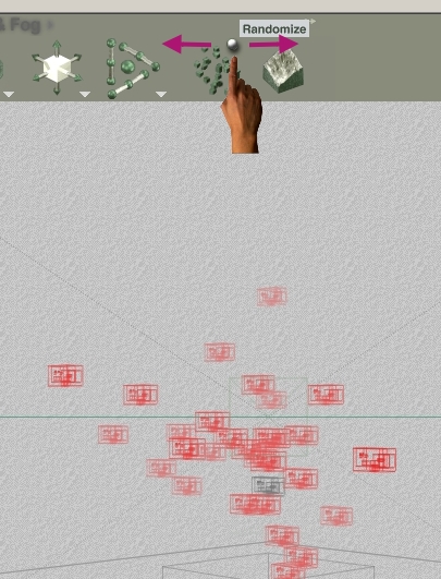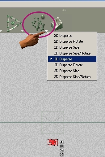 2. Deine Fischgruppe ist noch immer markiert, jetzt mache einen Linksklick auf die kleine Kugel rechts oberhalb des Streuwerkzeugs und fahre den Cursor bei gehaltener, linker Maustaste langsam nach rechts oder links (Richtung ist egal). Du siehst, daß deine Fische in alle Richtungen auseinanderdriften.