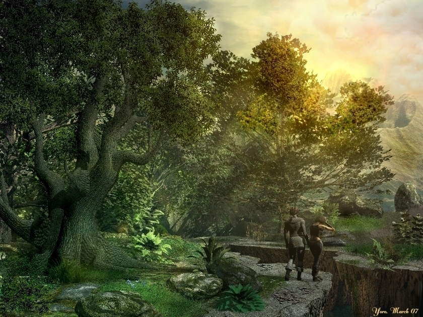 Auch hier wieder viel Beleuchtung mit PI und auch burn & dodge und der partielle Weichzeichner sind nicht zu kurz gekommen. Der Turm mit der schicken Landeplattform ist gekauft, die Bäume sind diesmal Billboards von XFrog (gibts bei DAZ) und die Figuren stammen natürlich aus Poser.