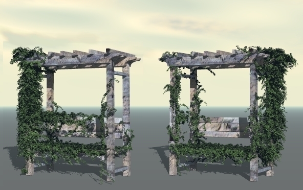 Hier habe ich in beiden Fällen die 'young leaves' mit einer Blütentex ersetzt. Beim linken Bild war die Blattgröße im Generator auf sehr klein gestellt, außerdem habe ich für den Efeu Anti Aliasing deaktiviert. Im Bild rechts steht die Blattgröße auf Maximum und es ist mit AA gerendert.