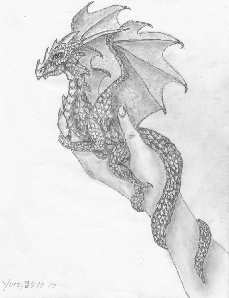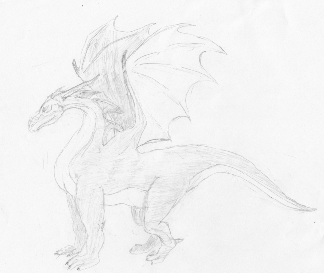 Ich hänge euch hier noch zwei Bilder mit dran; das eine ist mein allererster Drachen, das andere, die 'handvoll' Drachen, ist letzte Woche entstanden, und zwar ohne Referenzbild. Ein gewisser Lernprozess ist so langsam schon erkennbar ;).