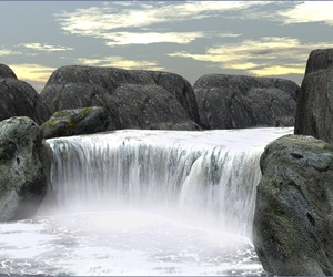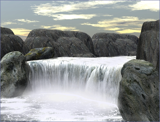 Wenn Wasser irgendwo herunterfällt und auf weiteres Wasser auftrifft, entsteht Gischt. Je nach Höhe nicht zu knapp! Die fehlt hier leider völlig, du kannst sie entweder mit gestauchten Kugeln und volumetrischer Tex erstellen, oder aber, du arbeitest sie zum Schluß per Postwork ein.