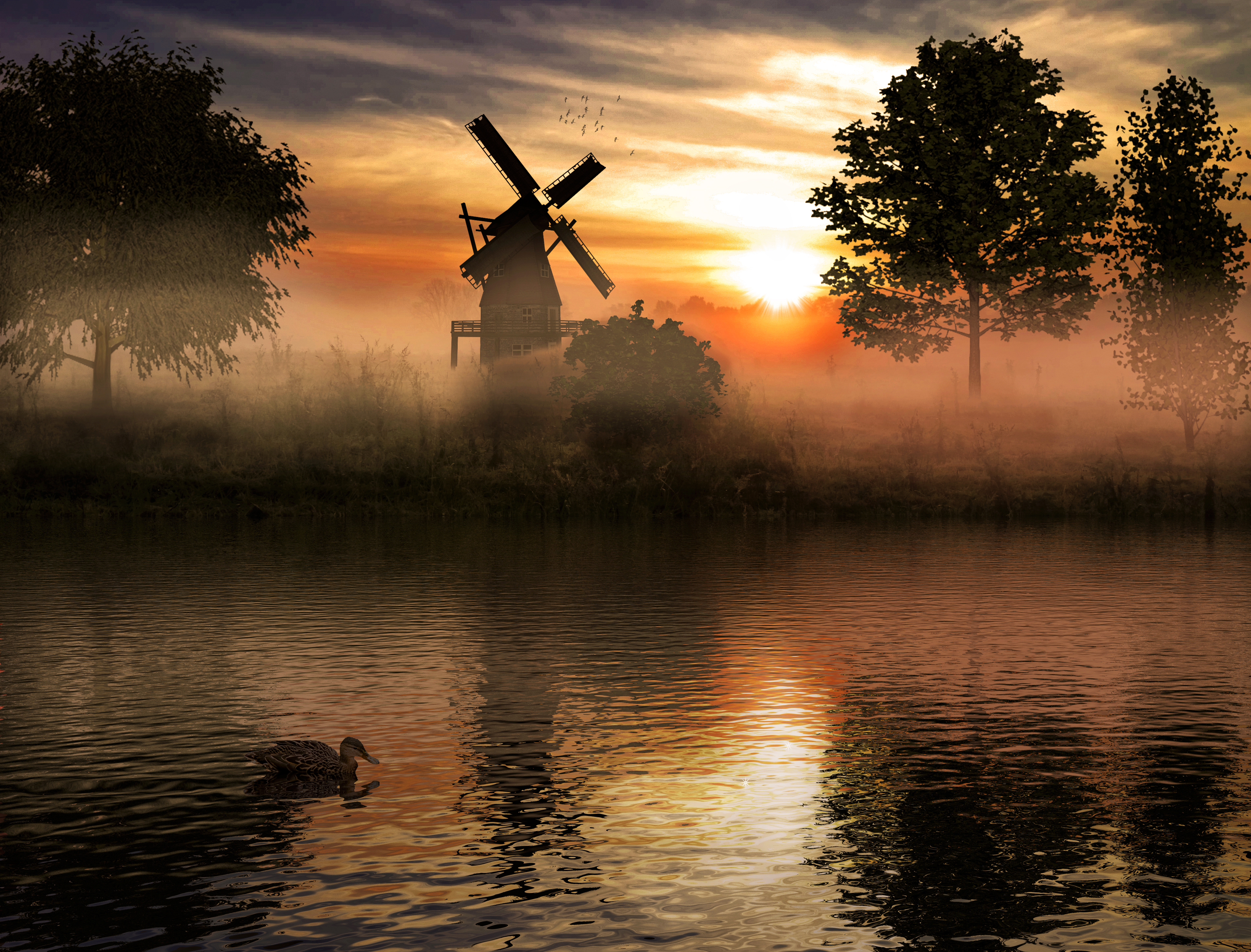 Der Render ist ca. 2 Jahre alt. Die Herausforderung war das Abendlicht. Ich weis nur noch die Ente ist 2D. Mühle und Bäume sind aus Cinema importiert.