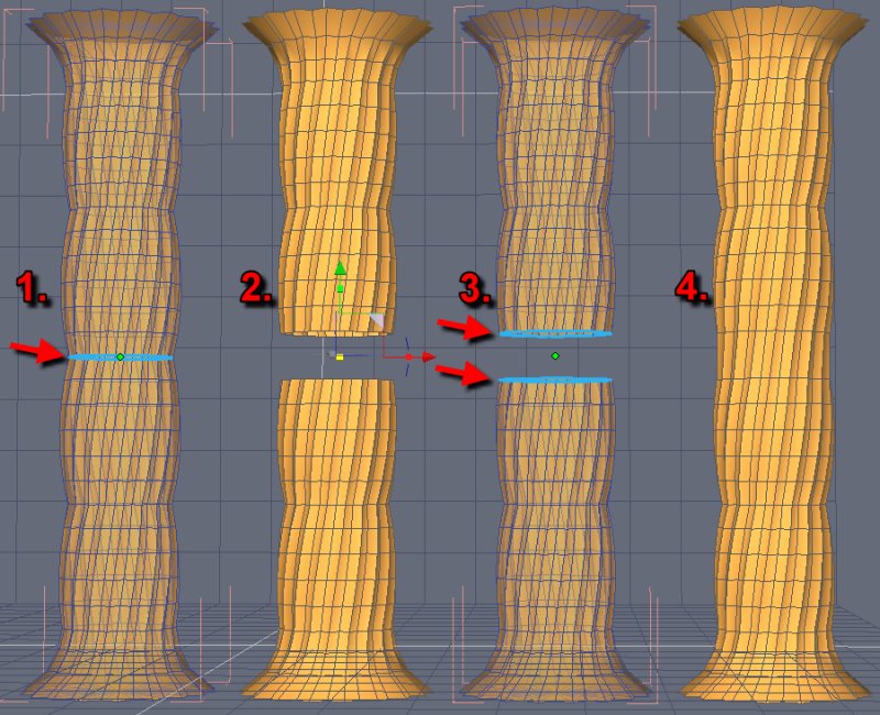 Bisher hab ich's so gemacht: Kante auswählen - Loop - Ring -> es werden alle Längskanten ausgewählt -> Convert selection to points -> Invert selection -> Backspace-Taste
