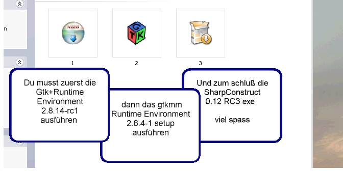 Habe erst die "gtk-dev-2.10.11-win32-1.exe" Instaliert, dann das "gtkmm-win32-runtime-2.10.7-1.exe" und "gtk-win32-2.8.14-rc1.exe", und zum schluß das "setup-sharpconstruct-0.12rc3-sse.exe" Instaliert.