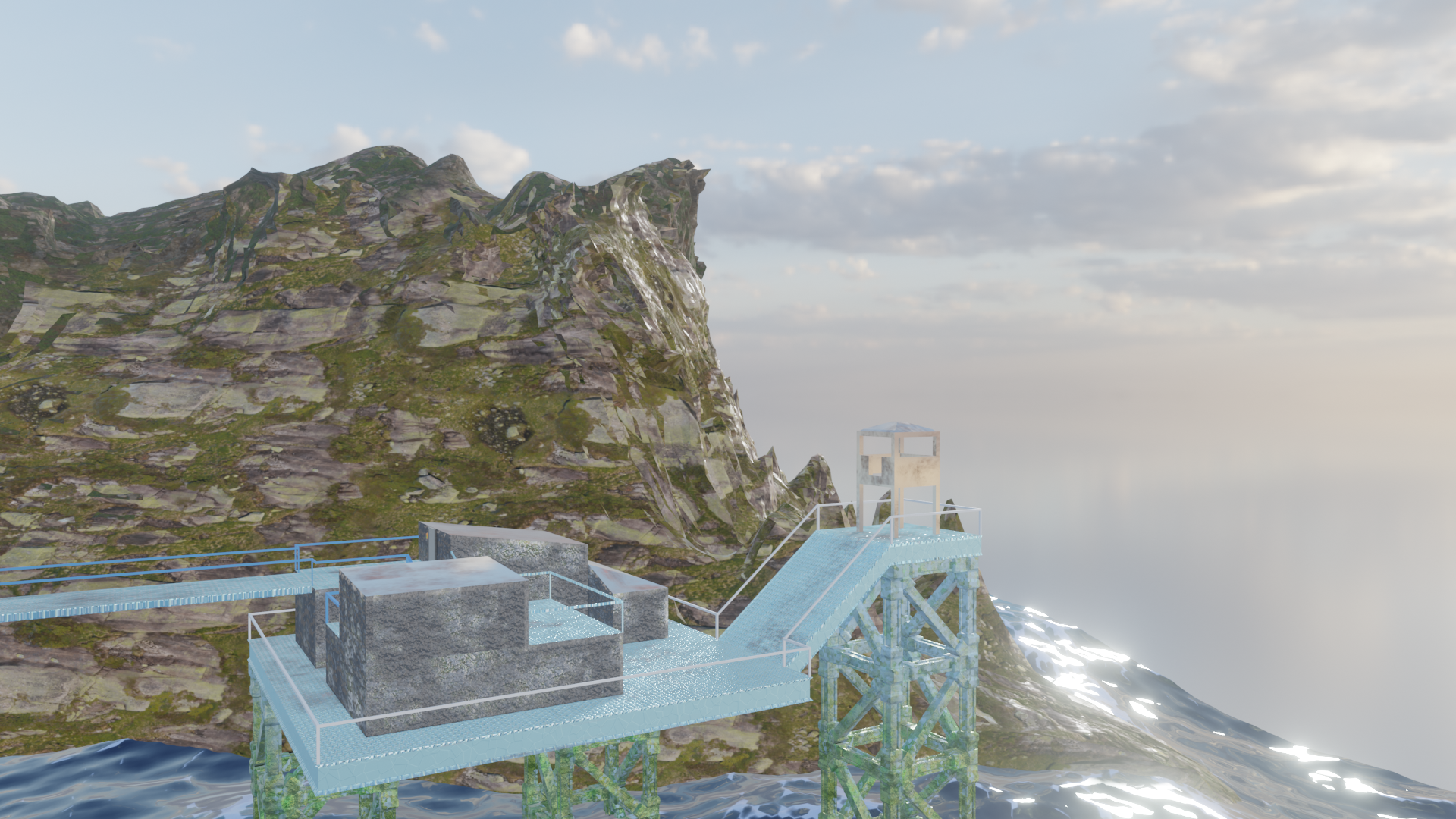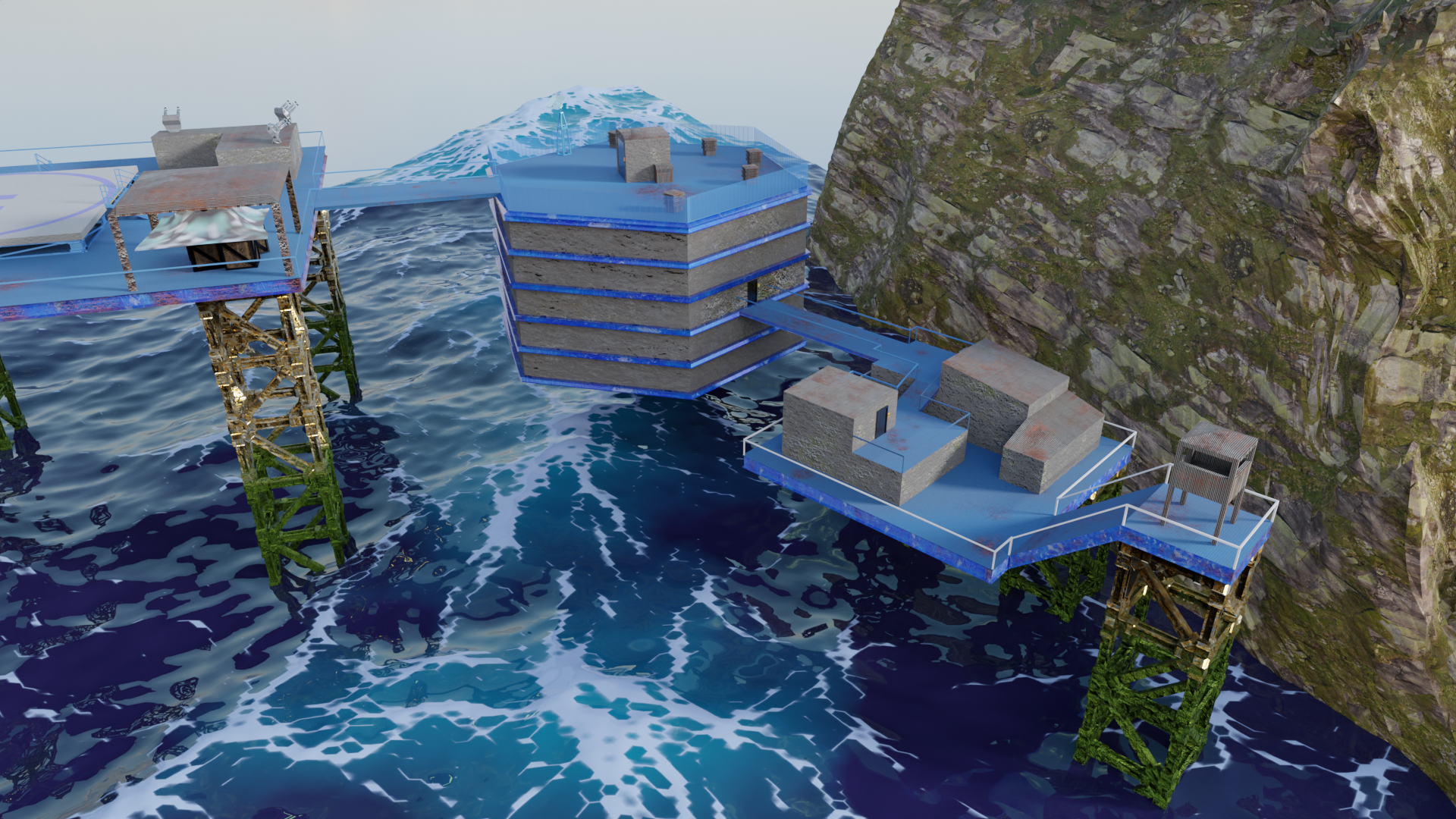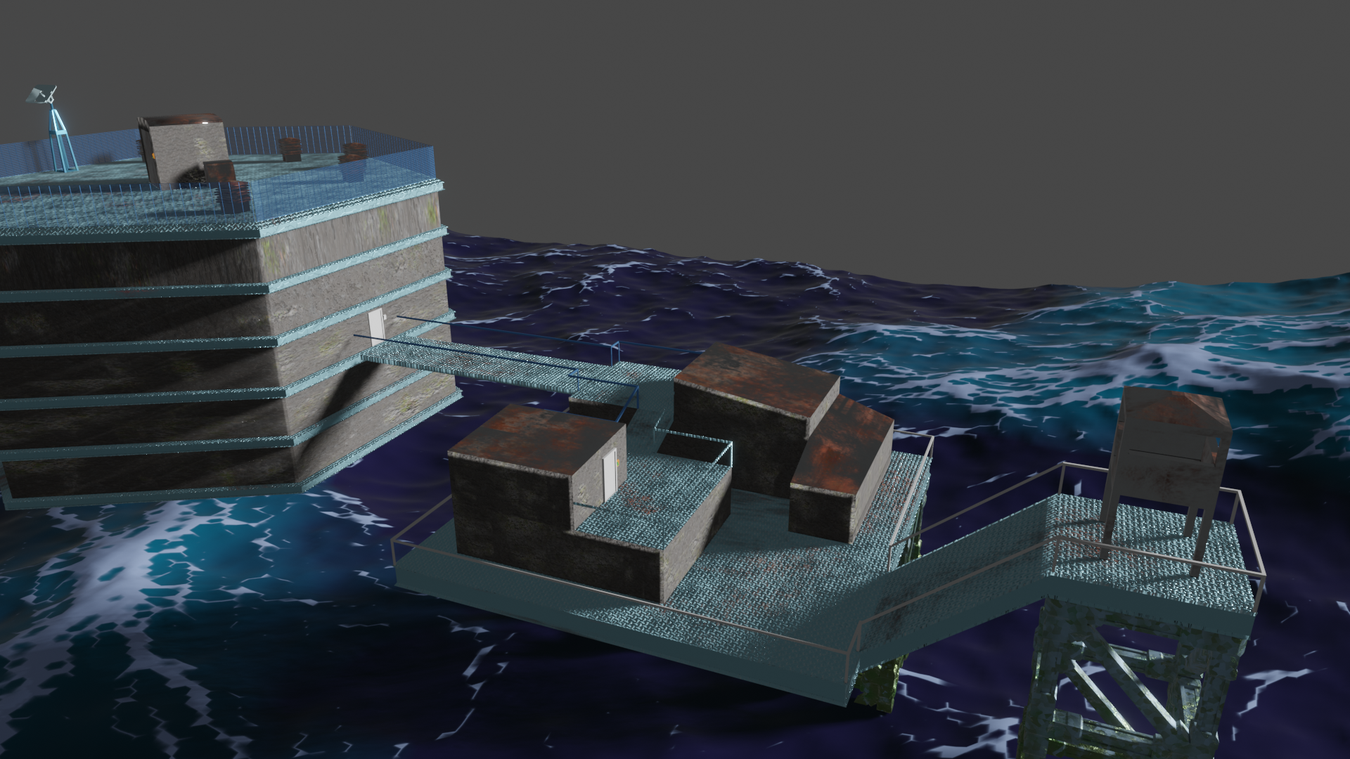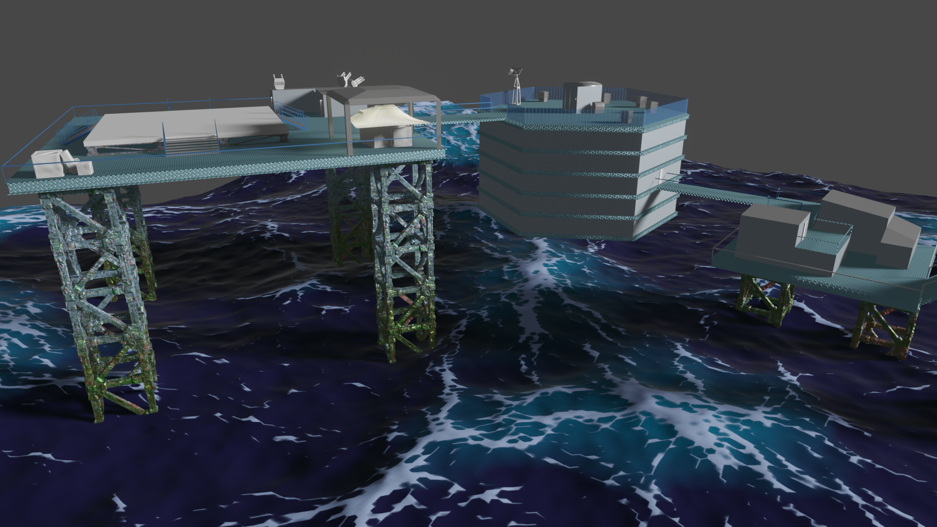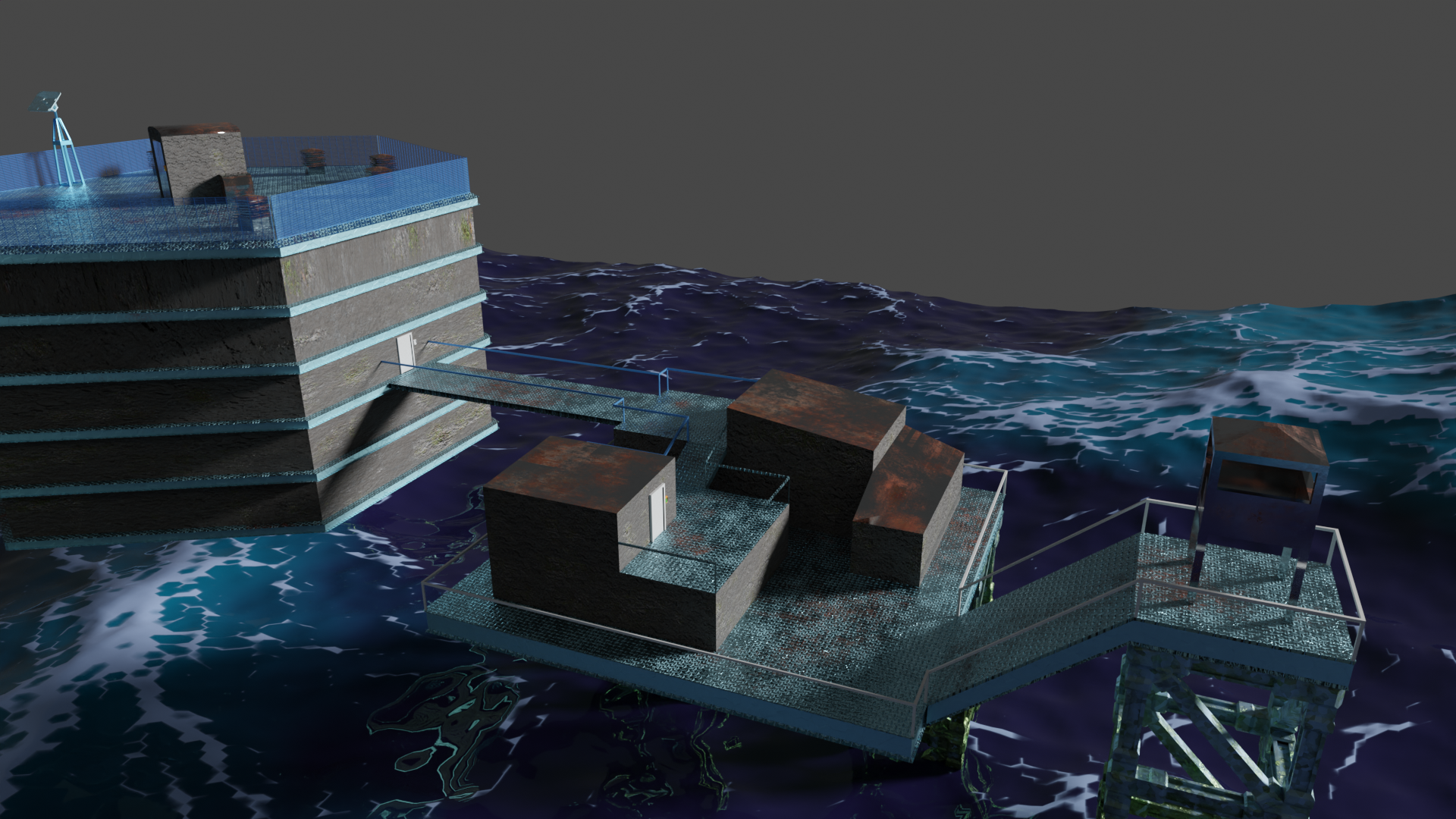 Habe nun so ziemlich alle prozeduralen Texturen, die ich gebastelt hatte, gegen Bildtexturen ausgetauscht und hier und da ein wenig Rost aufgemalt via Maske. Für mich schon weniger uncanny Valley. Wasser ist noch nicht erledigt. Die Dächer sind nun nicht mehr plattes Metal, sondern haben "Wellblech" (ok, latu Texture Welleisen :D), die Träger sind nun rostiges Metal und unten musste ich "Mogeln". Das ist Moos. ![]()