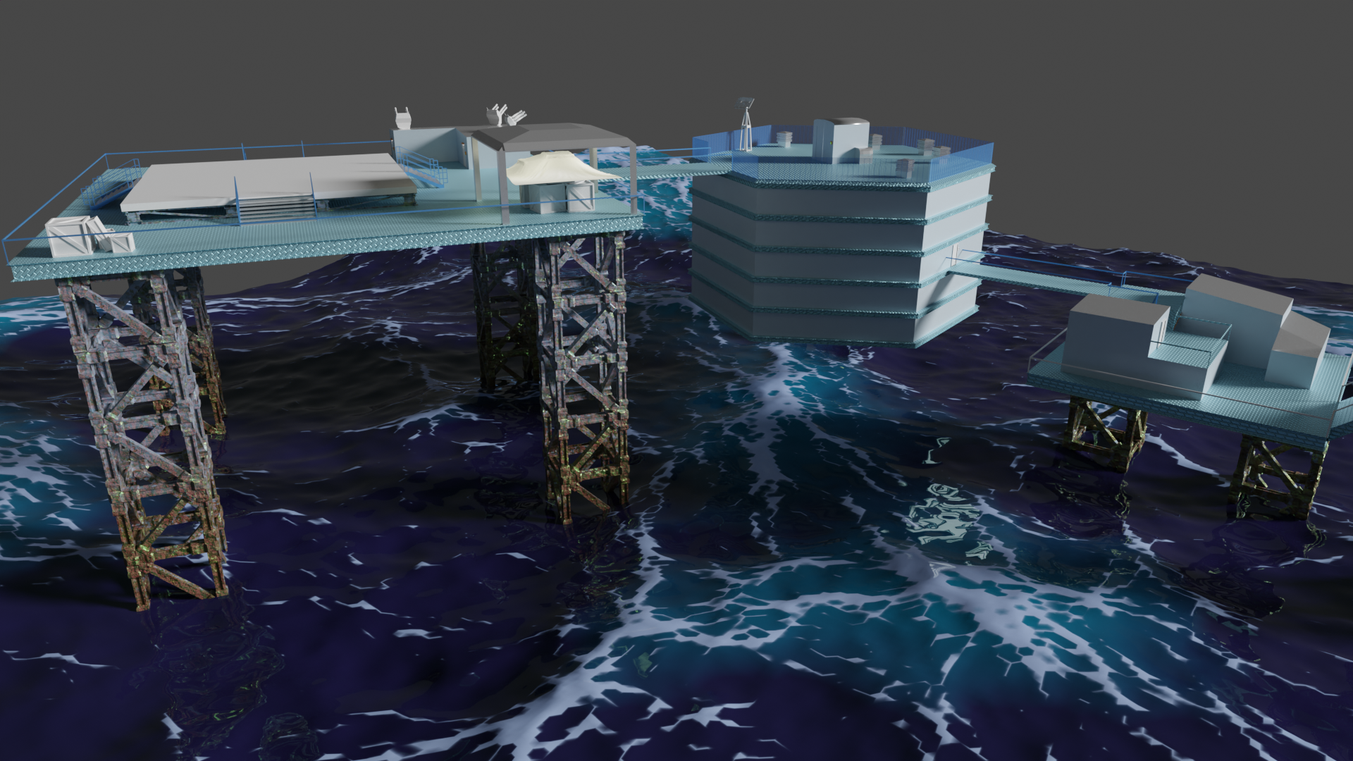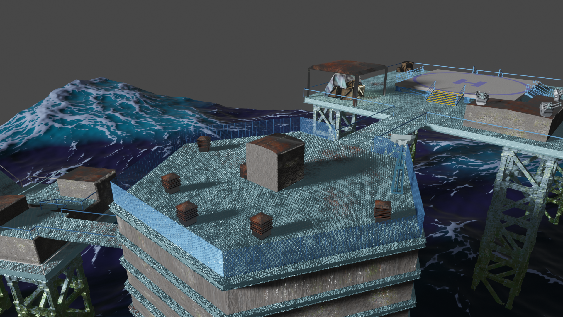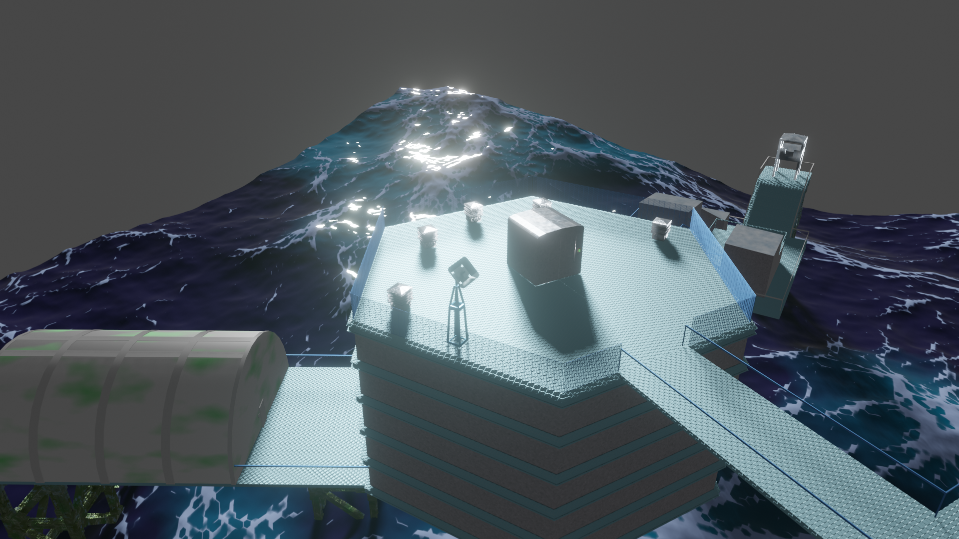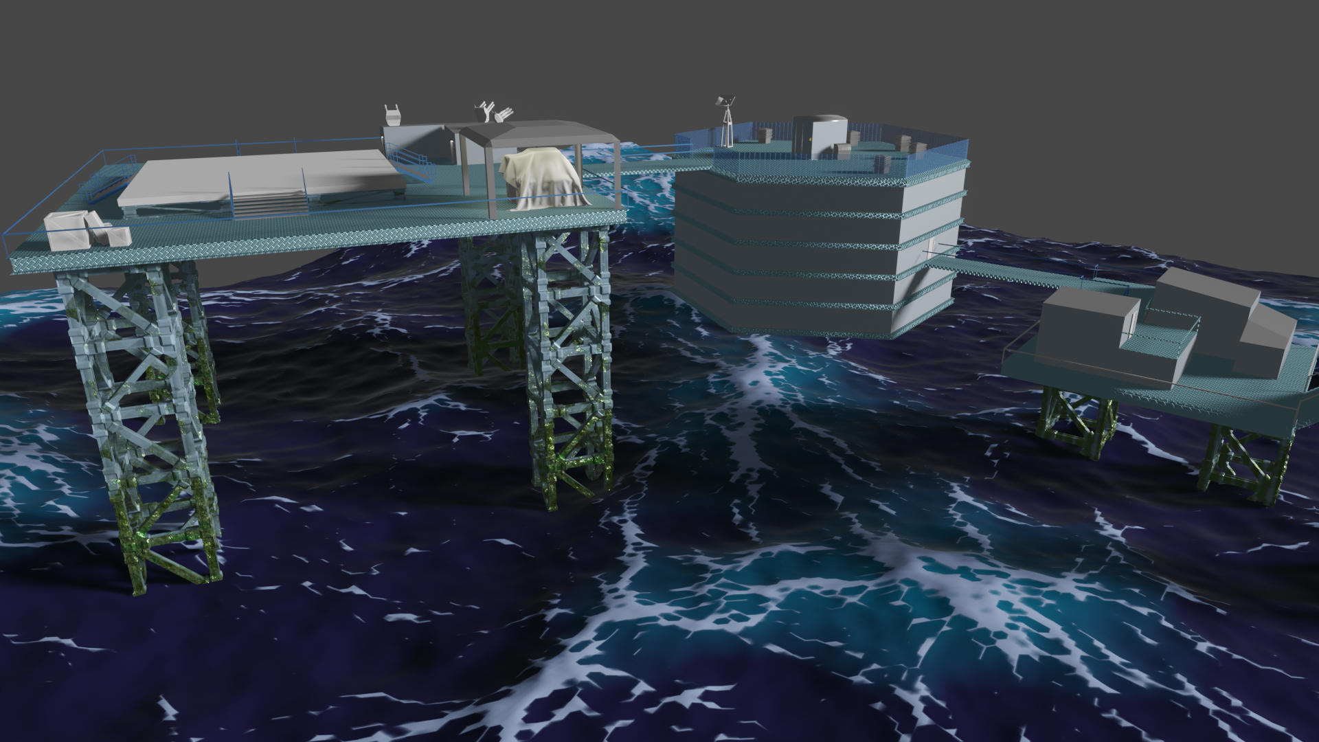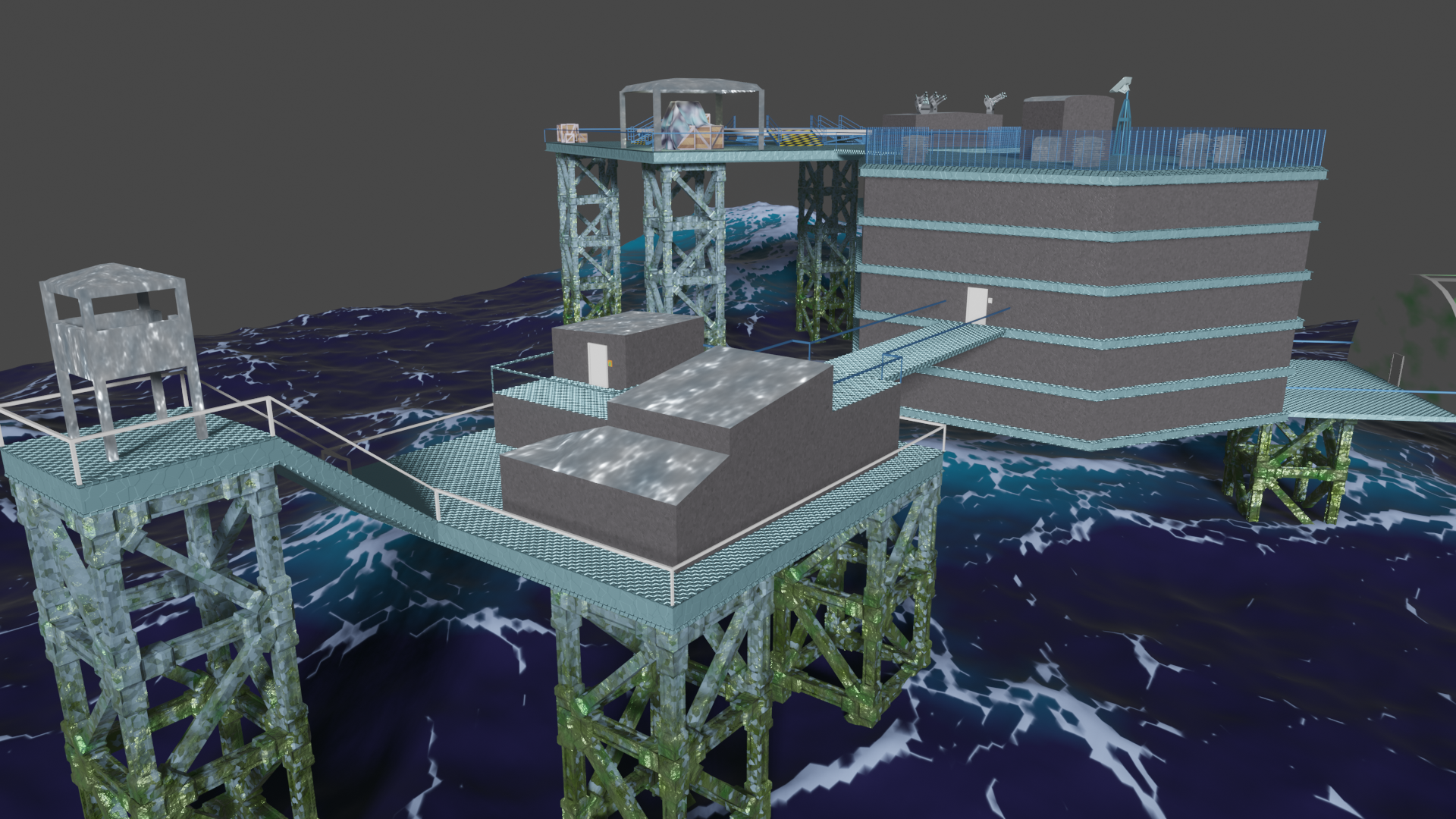 Habe nun so ziemlich alle prozeduralen Texturen, die ich gebastelt hatte, gegen Bildtexturen ausgetauscht und hier und da ein wenig Rost aufgemalt via Maske. Für mich schon weniger uncanny Valley. Wasser ist noch nicht erledigt. Die Dächer sind nun nicht mehr plattes Metal, sondern haben "Wellblech" (ok, latu Texture Welleisen :D), die Träger sind nun rostiges Metal und unten musste ich "Mogeln". Das ist Moos. ![]()