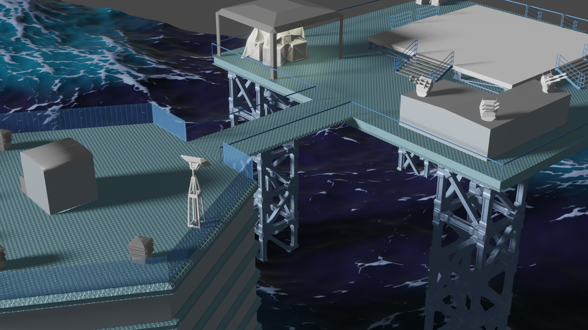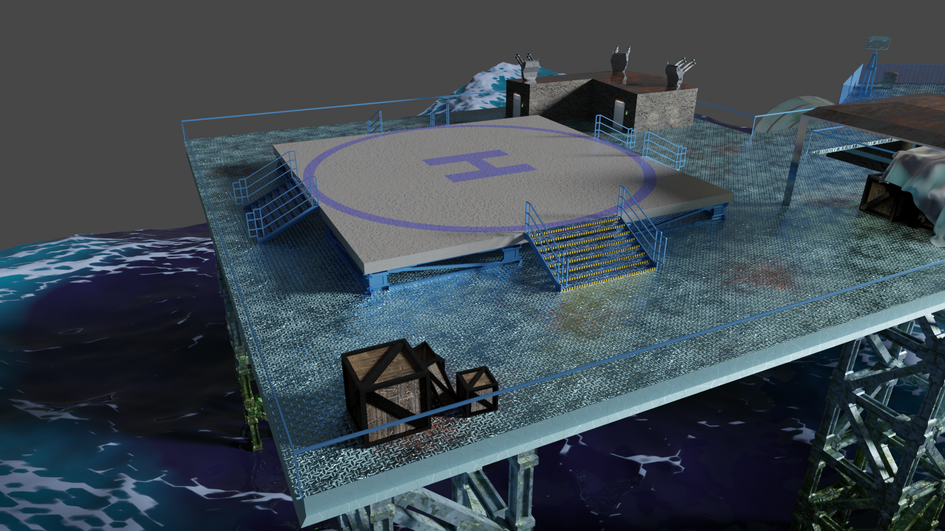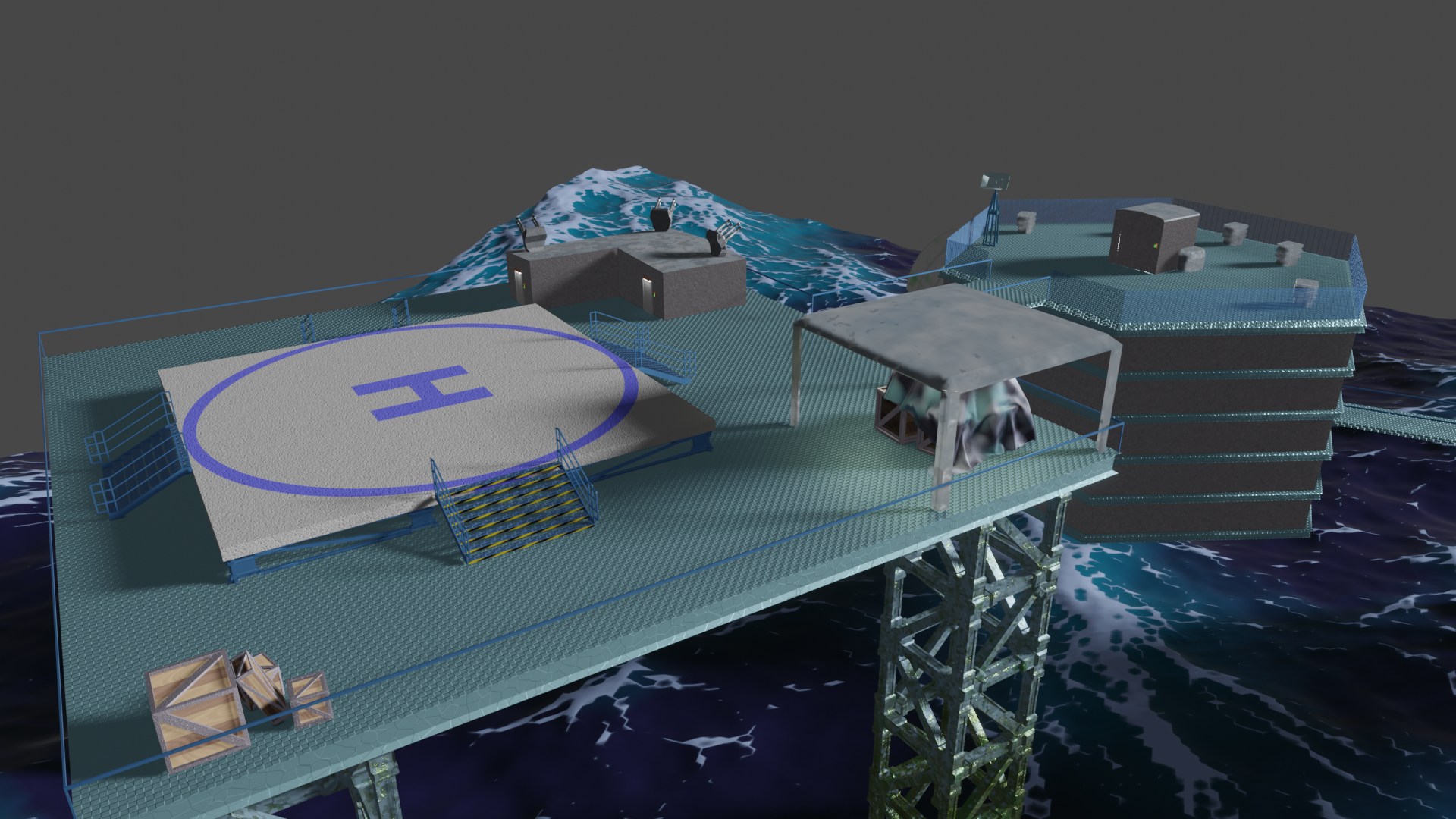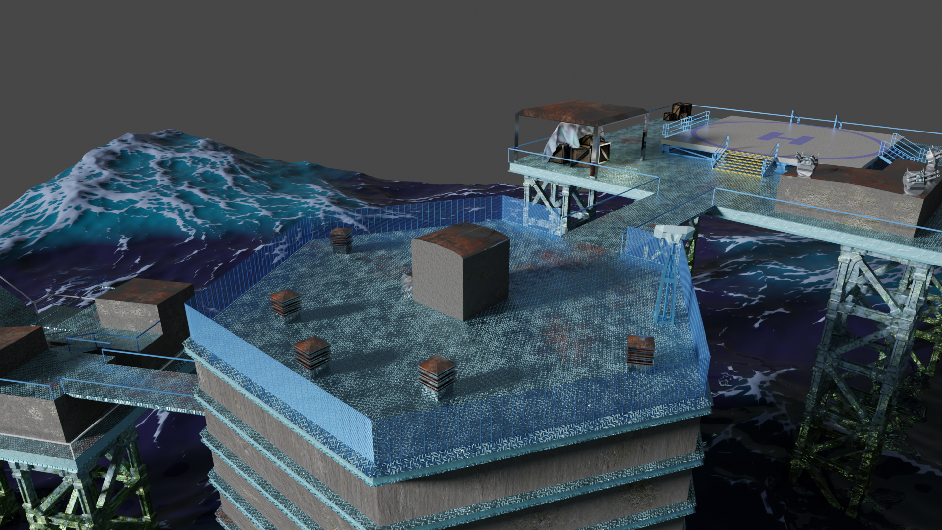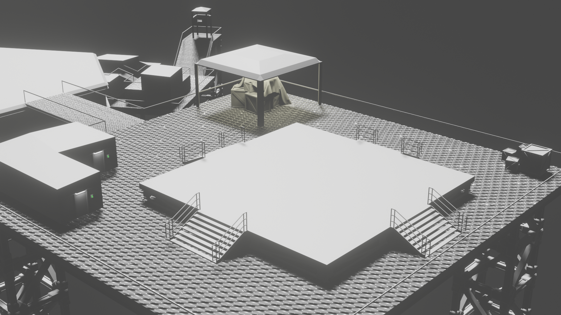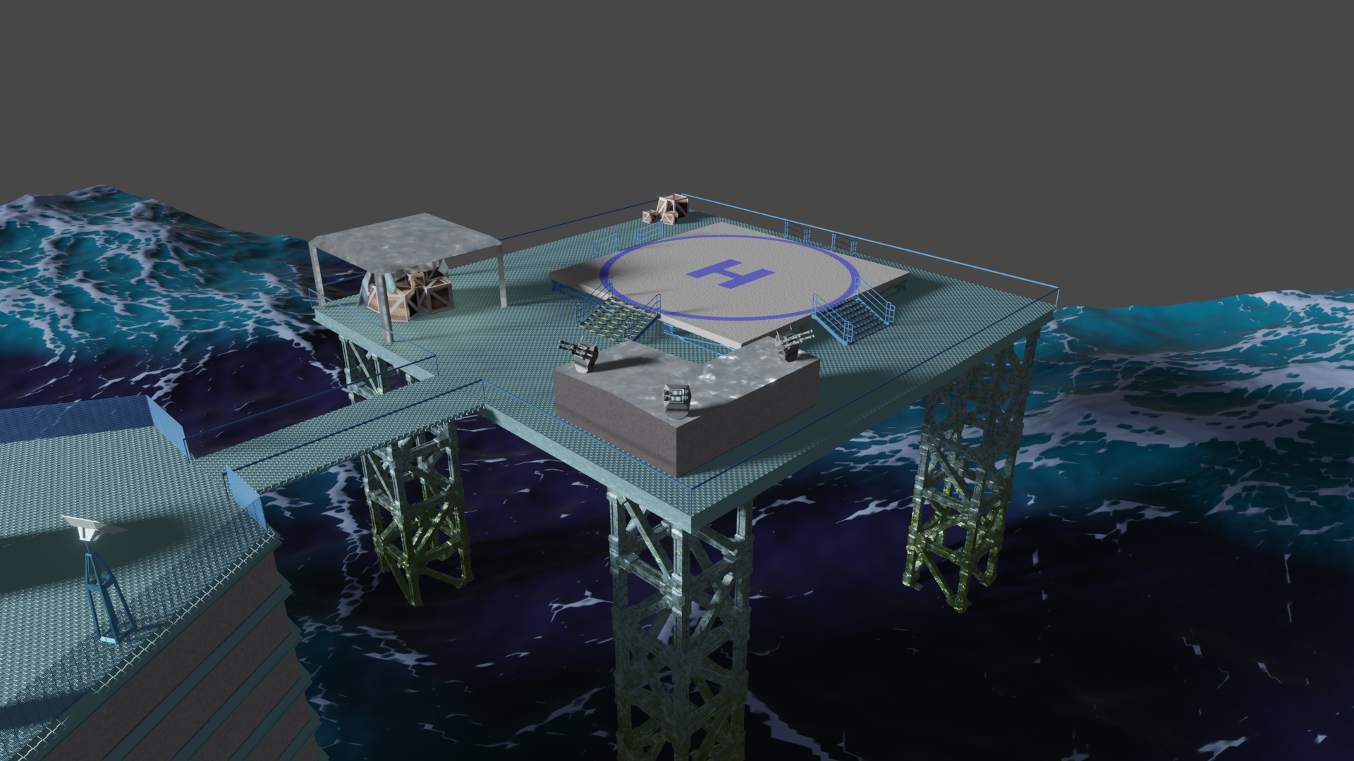Habe nun so ziemlich alle prozeduralen Texturen, die ich gebastelt hatte, gegen Bildtexturen ausgetauscht und hier und da ein wenig Rost aufgemalt via Maske. Für mich schon weniger uncanny Valley. Wasser ist noch nicht erledigt. Die Dächer sind nun nicht mehr plattes Metal, sondern haben "Wellblech" (ok, latu Texture Welleisen :D), die Träger sind nun rostiges Metal und unten musste ich "Mogeln". Das ist Moos. ![]()