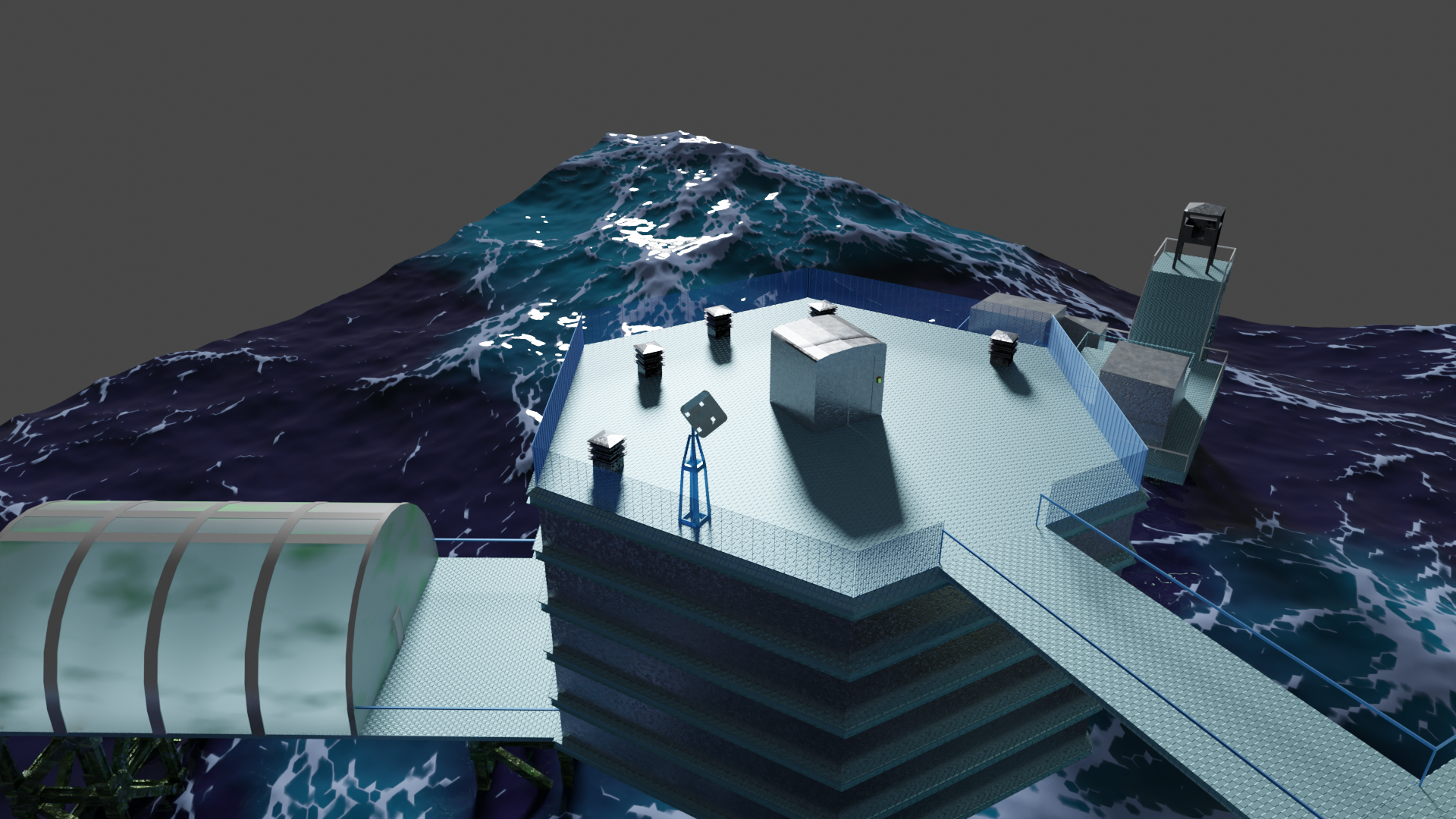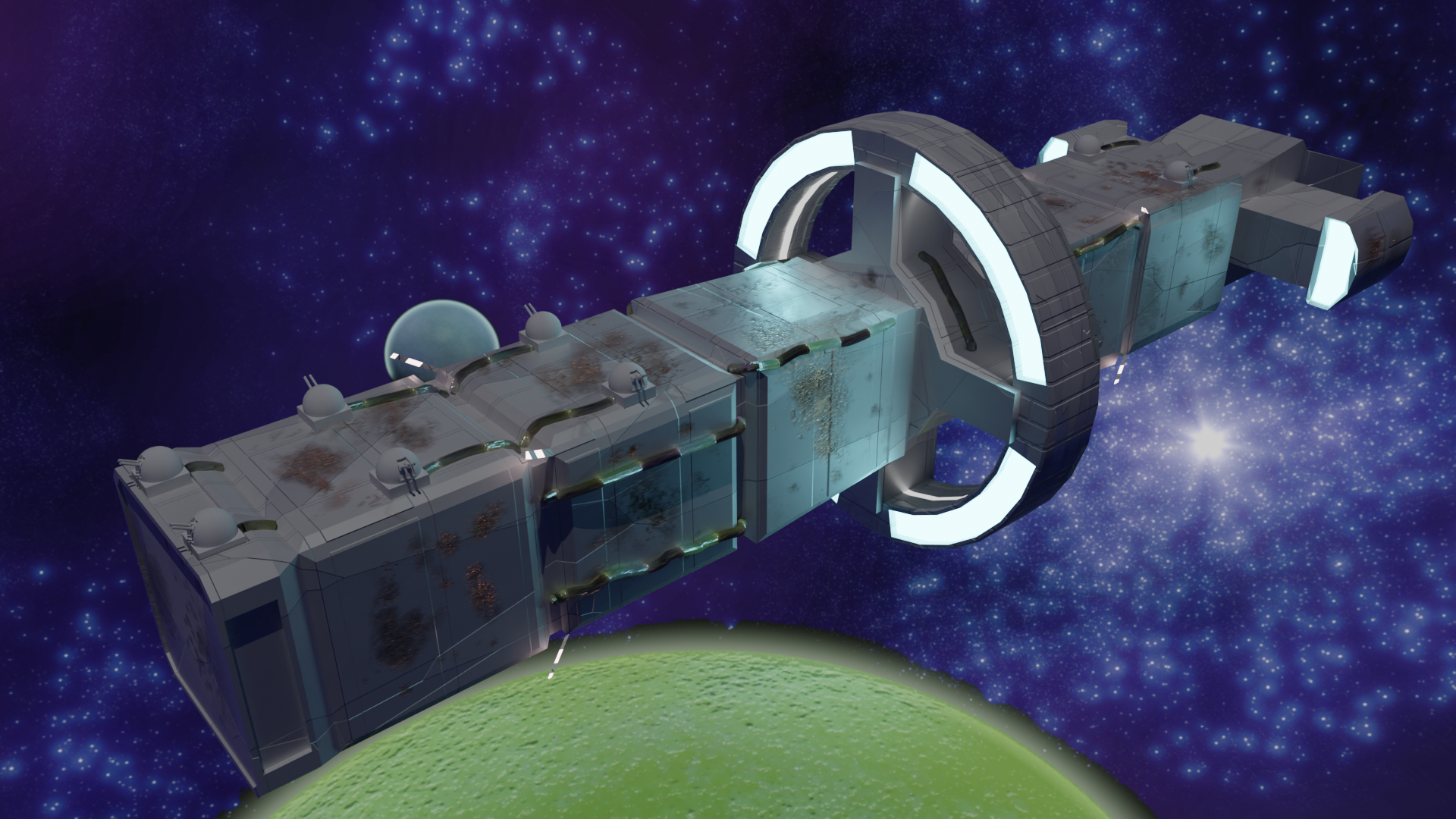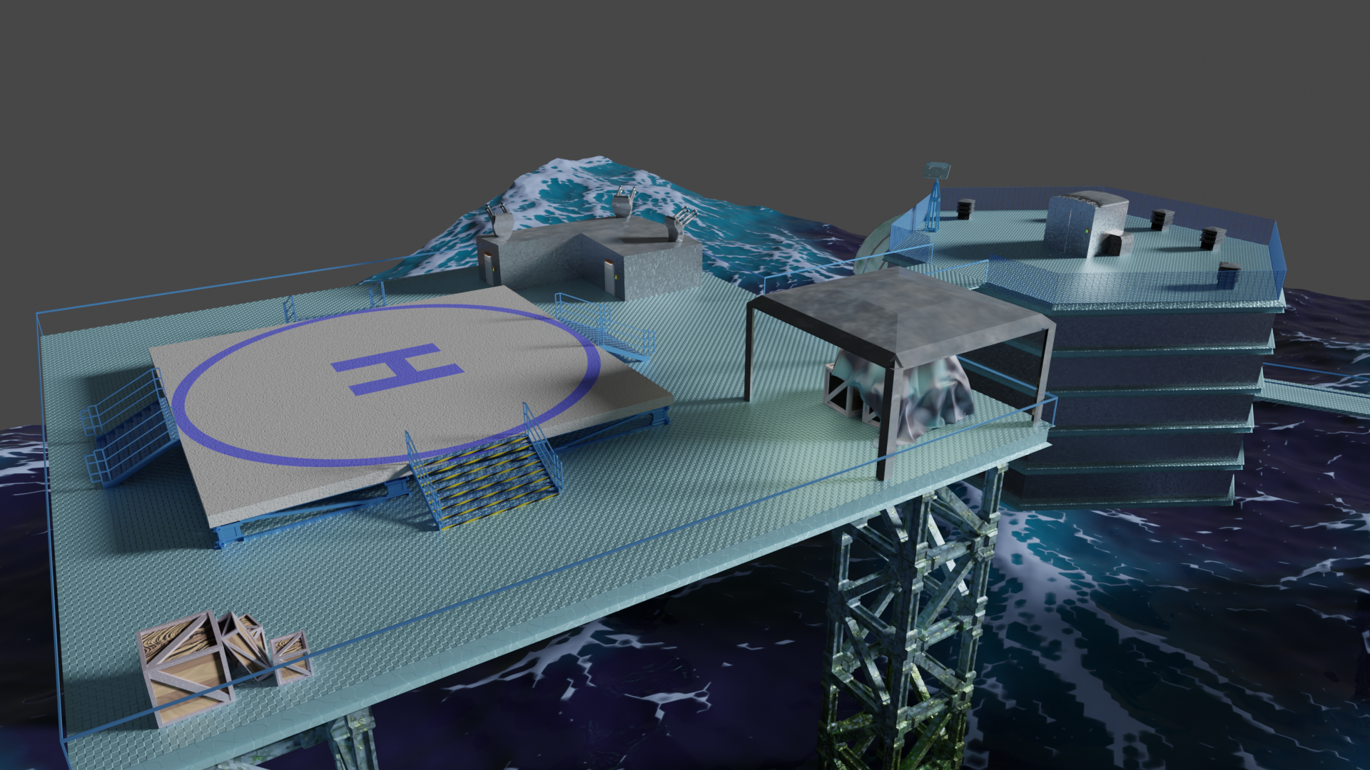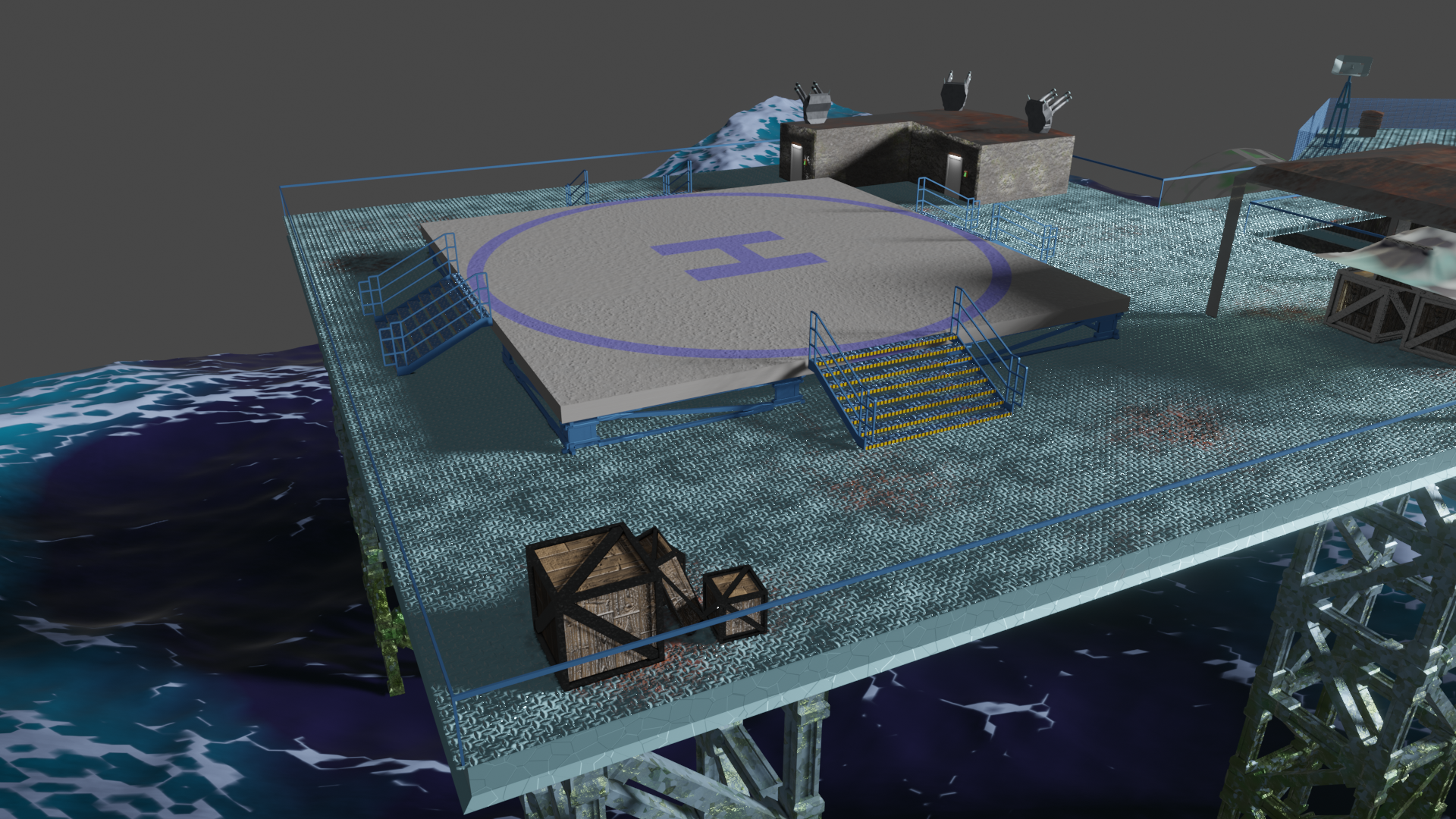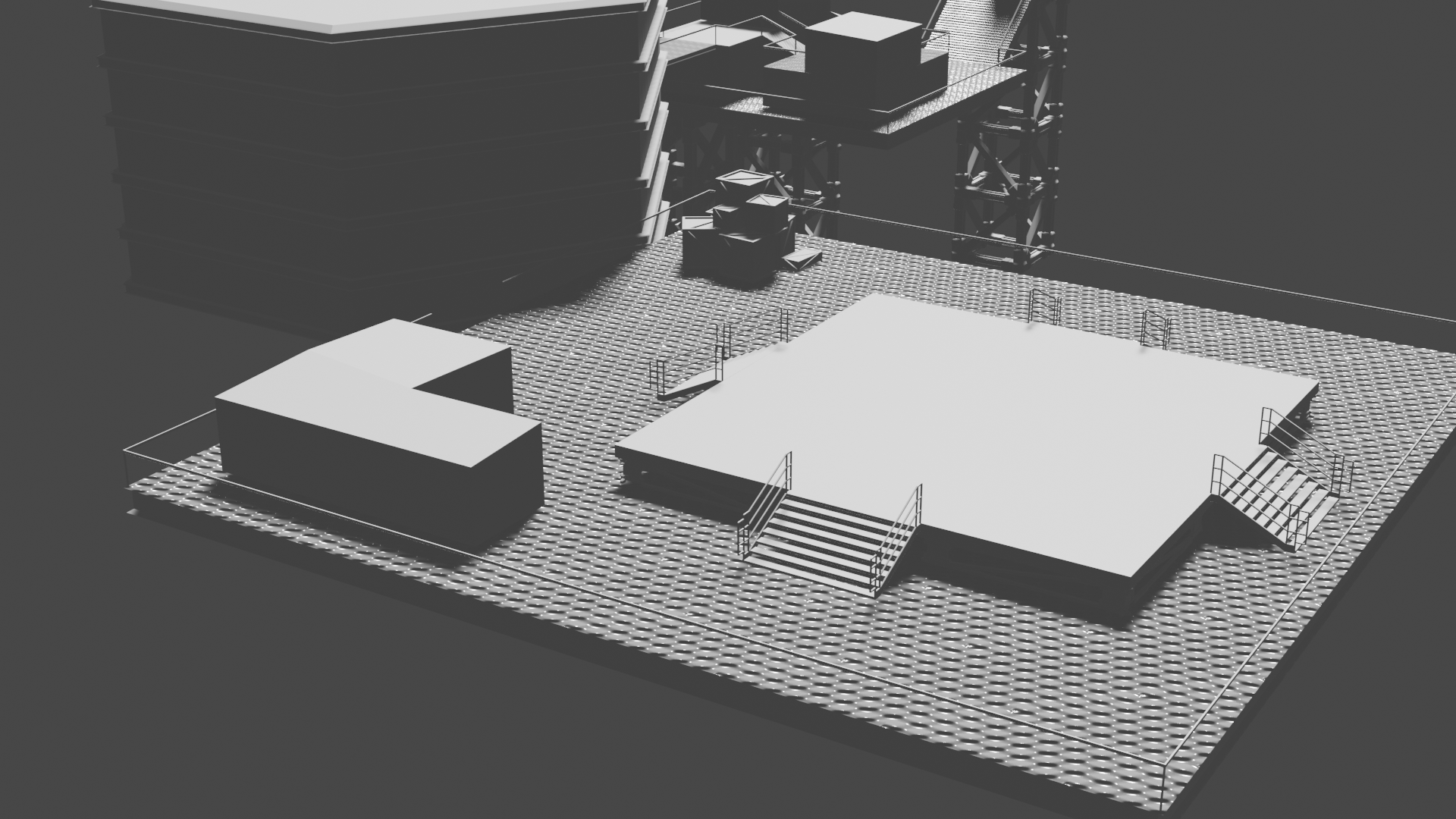 Habe nun so ziemlich alle prozeduralen Texturen, die ich gebastelt hatte, gegen Bildtexturen ausgetauscht und hier und da ein wenig Rost aufgemalt via Maske. Für mich schon weniger uncanny Valley. Wasser ist noch nicht erledigt. Die Dächer sind nun nicht mehr plattes Metal, sondern haben "Wellblech" (ok, latu Texture Welleisen :D), die Träger sind nun rostiges Metal und unten musste ich "Mogeln". Das ist Moos. ![]()