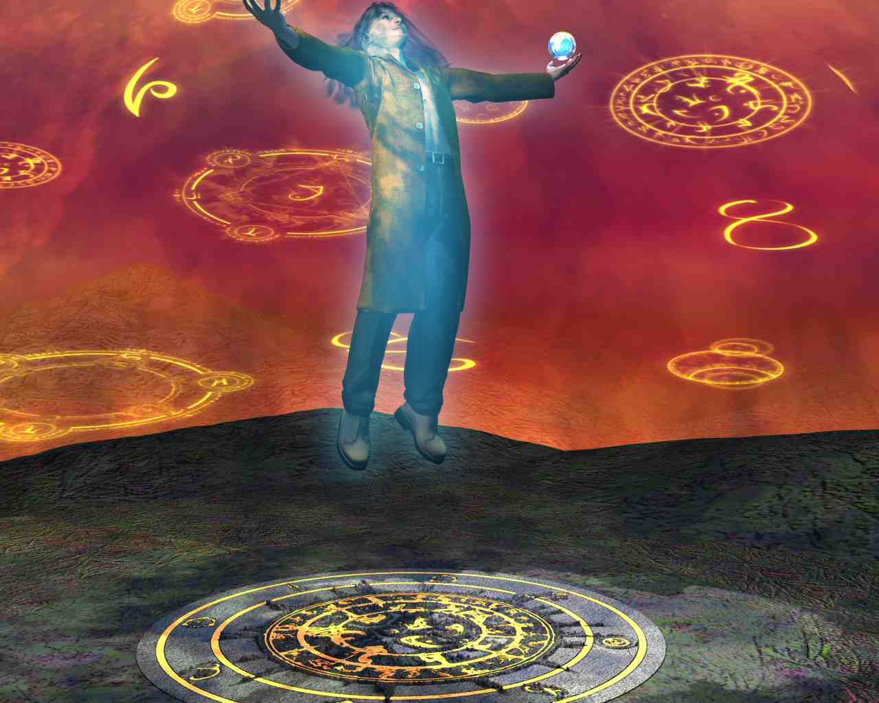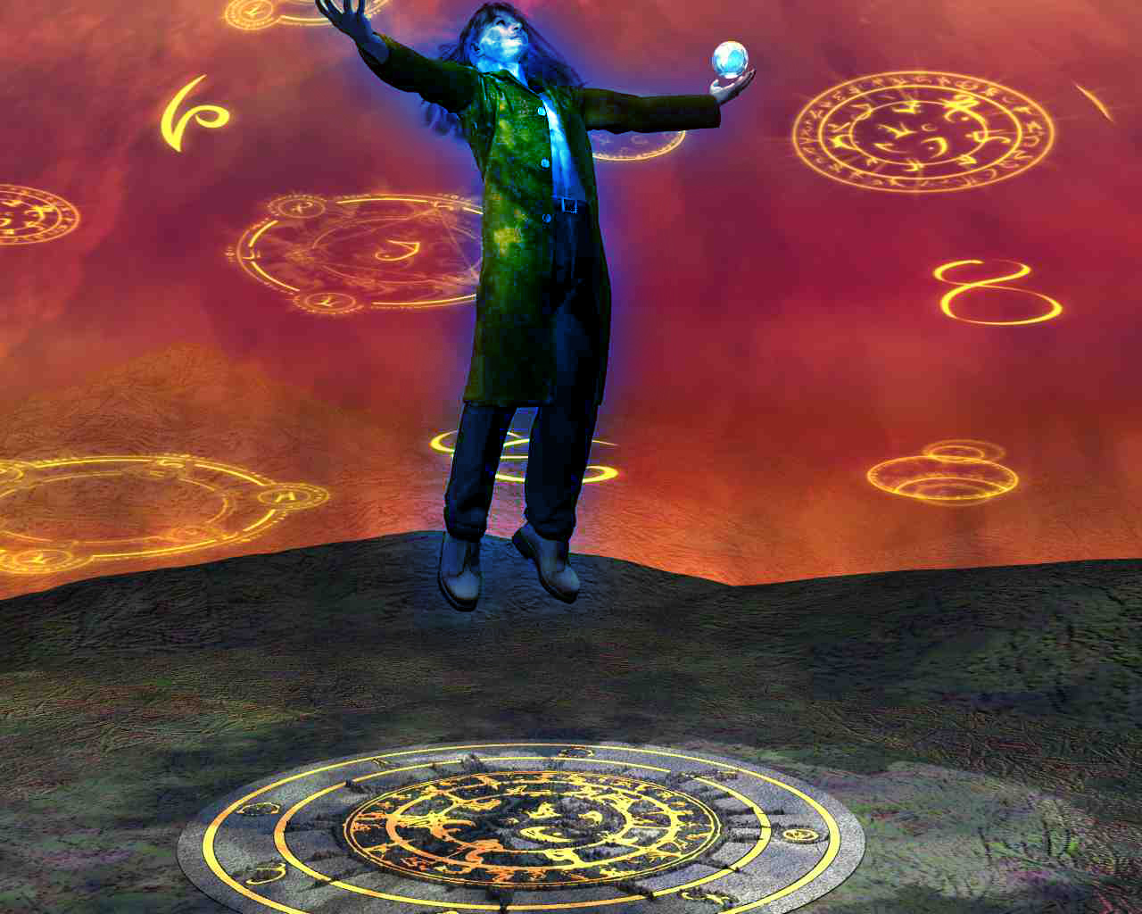 Das mit dem Lichtband hat wie gesagt noch nicht so den Effekt wie es soll. An sich sollte das den üblichen Lichtstrahl von oben ersetzen (zusammen mit der LIchtkuppel). Der Schatten des Mannes liegt leider genau außerhalb der Kamera. Die Lichtkuppel oben und die beiden Lichtkugeln in seinen Händen verwerfen das ganze. In meiner ersten Einstellung konnte man den Schatten zwar sehen, aber durch den mangelnden Abstand zwischen Gras und Füßen sahs halt ncht schwebend aus.