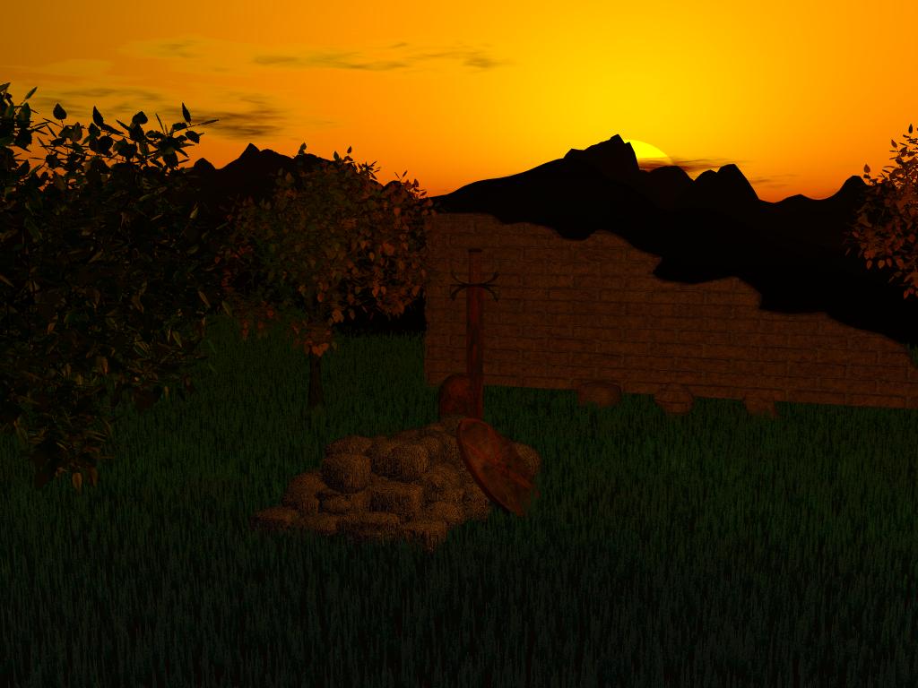 Hier mal ne andere Variante. Habe einen Sonnenuntergang gesetzt und die Textur der Berge so, dass man nur noch die Umrisse sieht. Damit man vorne das grab noch erkennt dort ein kleines Licht hingesetzt. Mich wundert irgendwie wie extrem Bryce mit Licht umgeht. Ists nacht ists dunkel, Sonne geht mal so gerade eben überm horizont auf und es ist hell. Oder das Licht ist komplett weg bei Sonnenständen, wo eigentlich noch welches da sein müsste... Waren die auch mal draußen, oder nur in ihren Büros? ;)