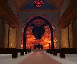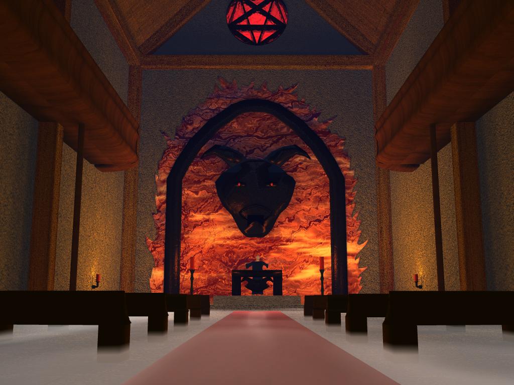 Brycetechnisch hat mich die Auswirkung von Soft Shadows auf das Radial Light außen vor dem Pentagramfenster verwundert. Anstatt schön unheimlich rötlich ausgeleuchtet zu sein wurde es plötzlich weiß, da sind Soft Shadows aus, die anderen vier Lichtquellen sind hingegen auf voll Soft Shadow festellt. Schlägt sich übelst auf die Renderzeit nieder, aber sieht doch um Längenbesser aus, als oben einfach zei Balken als Schatten zu sehen. *g*