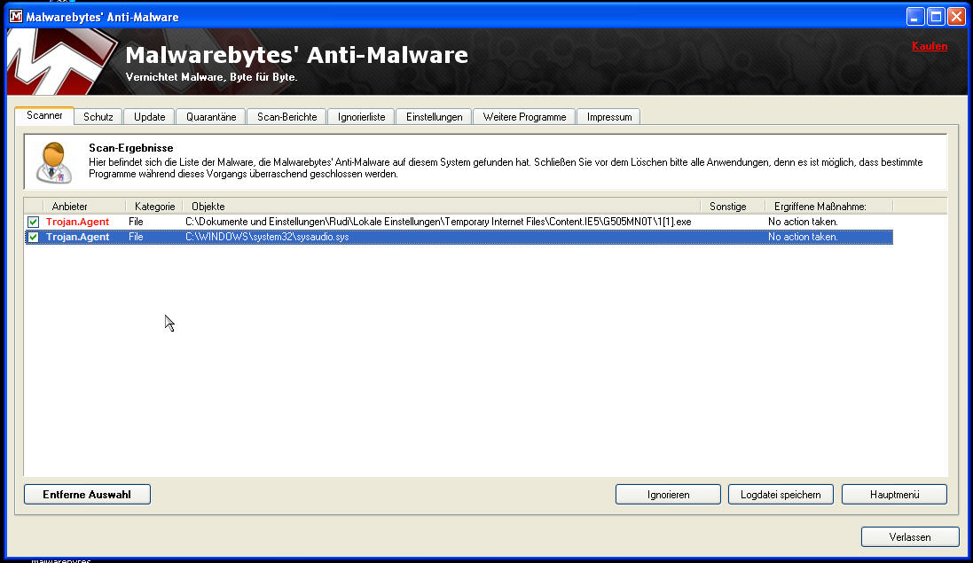 Kaspersky hat nix gefunden, Spybot hat nix gefunden, aber wie Sigma schon sagte, Malewarebytes Anti-Malware hat anscheinend was gefunden und zwar eine Datei Namens sysaudio.sys die normalerweise im Pfad "c:\windows\system32\drivers" zu finden ist, bei mir war sie aber zwei mal nämlich auch noch im "c:\windows\system32" keine Ahnung woher die kam,