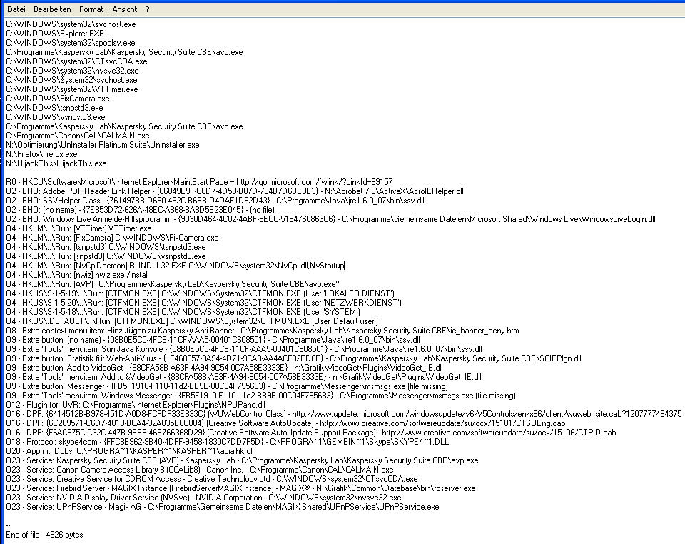 Daß die Antivirenprogramme nicht zu 100% schützen ist mir schon klar, ich lass jetzt mal von Kaspersky den ganzen PC untersuchen, und sieh mal was er tut, und dann versuch ich's mal mit Spybot, vor dem Formatieren hab ich keine Angst, ich mach sowas öfters zwischendurch danach ist auch Windows wieder abgespeckt, und man weiß schon welche Software man nicht wieder installieren braucht, die nur den Rechner zumüllt